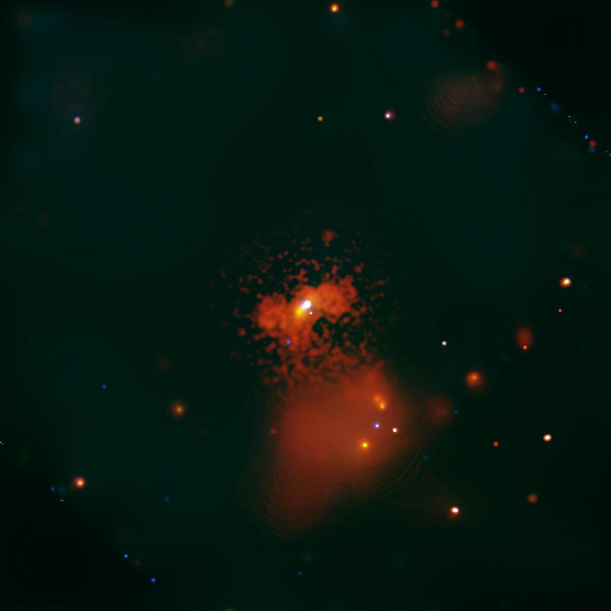 Technical details: We radioed instructions to the robotic orbiting telescope to tell it to point at Arp 220. The individual X-rays were measured on the spacecraft, and their properties were radioed back to Cambridge. We figured out where the telescope had been pointing and constructed the image using a standard set of software, and then started on specialized work to make this artistic version of the data. The image was processed to remove cosmic rays, bad pixels and other blemishes, corrected for pixel-to-pixel differences in sensitivity on the camera, and reconstructed to remove blurring due to the motion of the spacecraft pointing direction. It was then split into three color bands and adaptively smoothed using an algorithm by Harald Ebeling. The color balance and stretch was then manually tweaked to bring out fine details. Two different smoothing scales were used in the red band: a short one for the galaxy and a long one for the southern cluster; the two reconstructions were then blended with a distance-based gaussian taper.