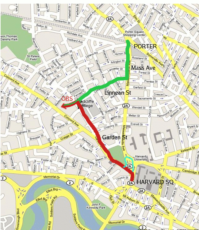You can get to the Observatory from Harvard Square up Garden St (red path, with cyan one-way detour if you are driving) or from Porter Square (green path), down Mass Ave and then right on Linnean. The Obs entrance is at the intersection of Garden and Linnean. You'll see "Perkin Lab for Astrophysics" at the entrance, don't ask why. See the detailed map below.