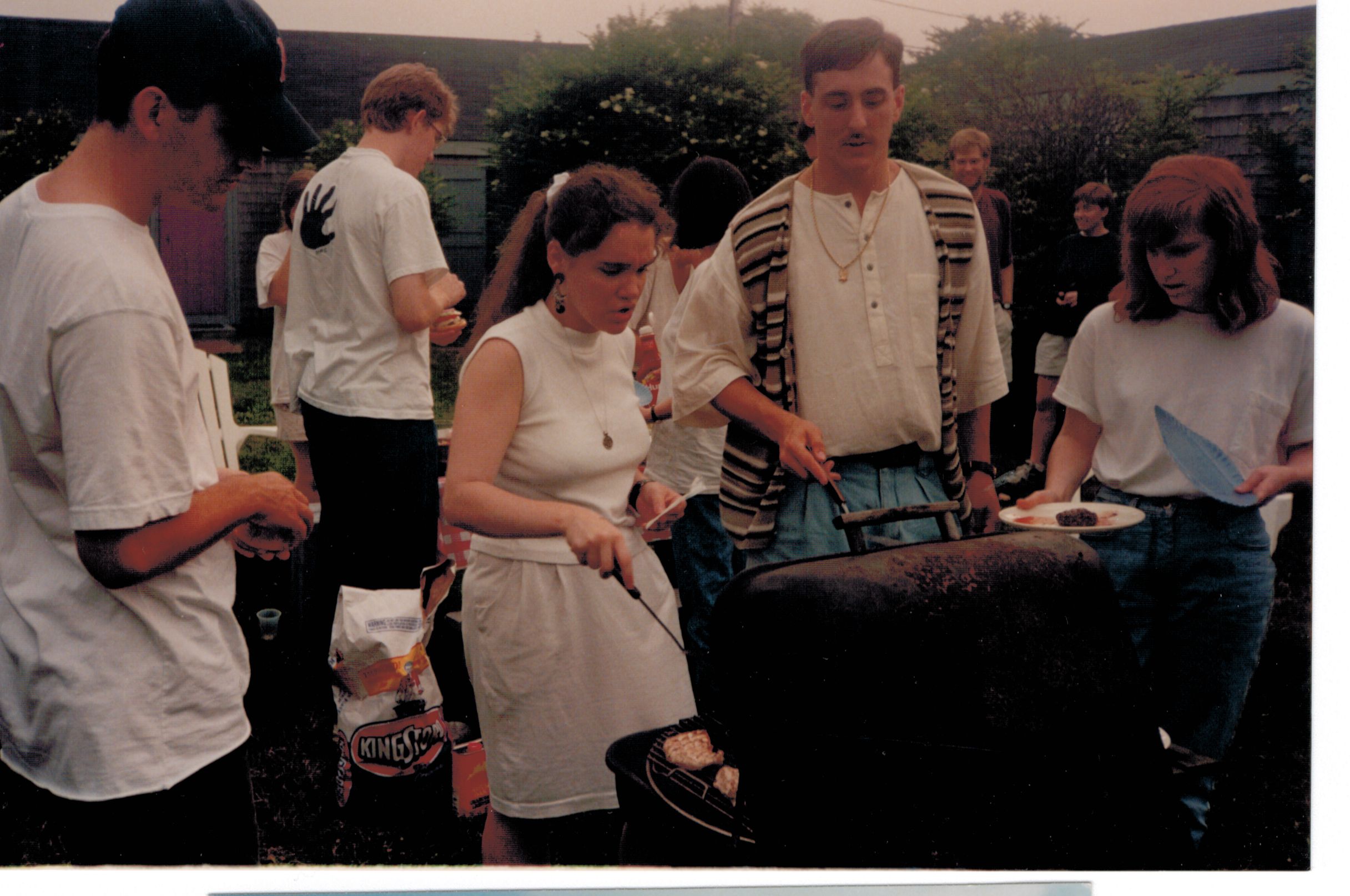 p006.jpg 1995: Tania Ruiz at the barbeque serving Steve Stanec and Wendy Lane |