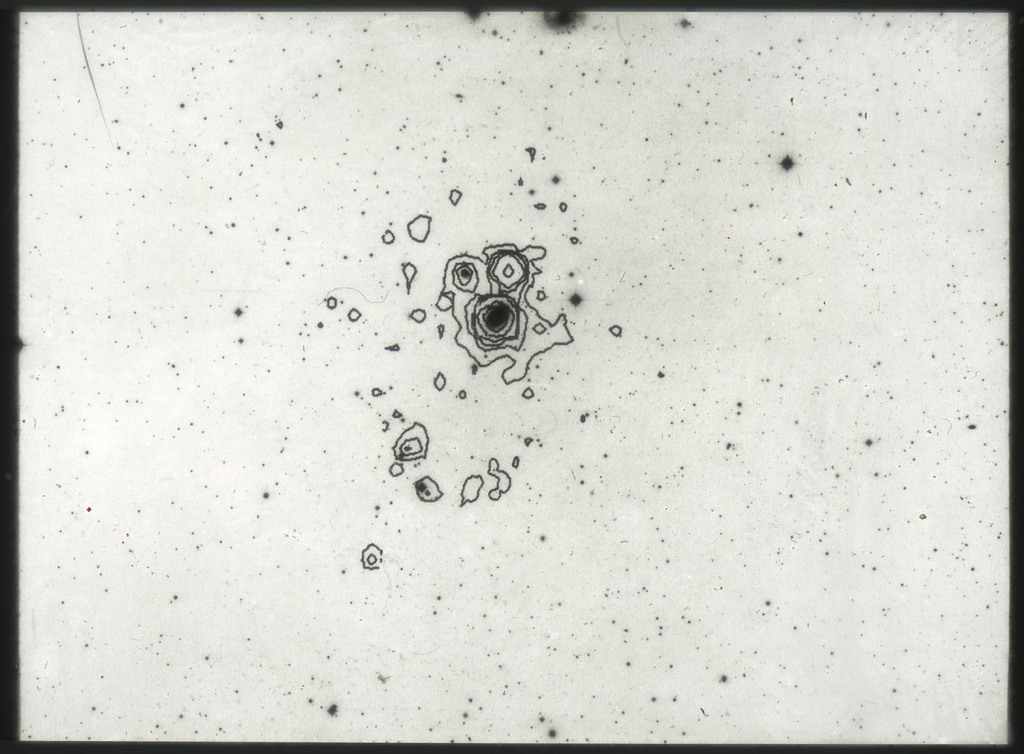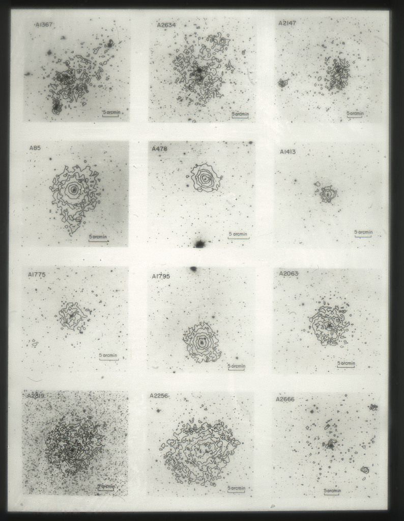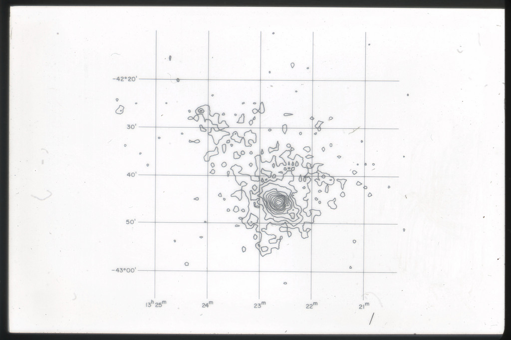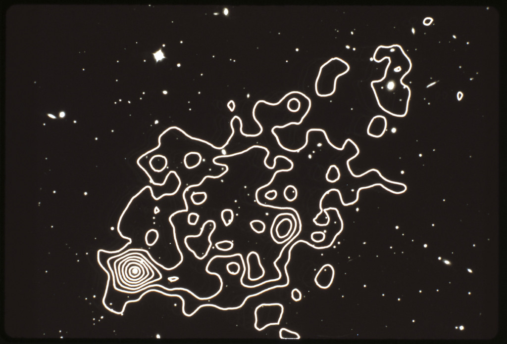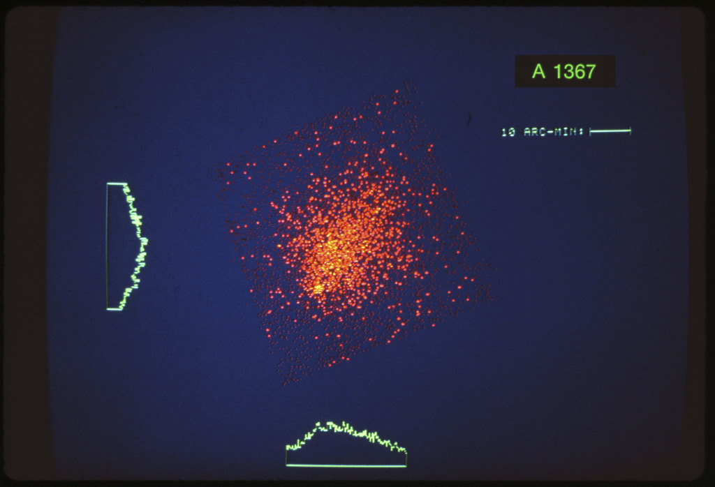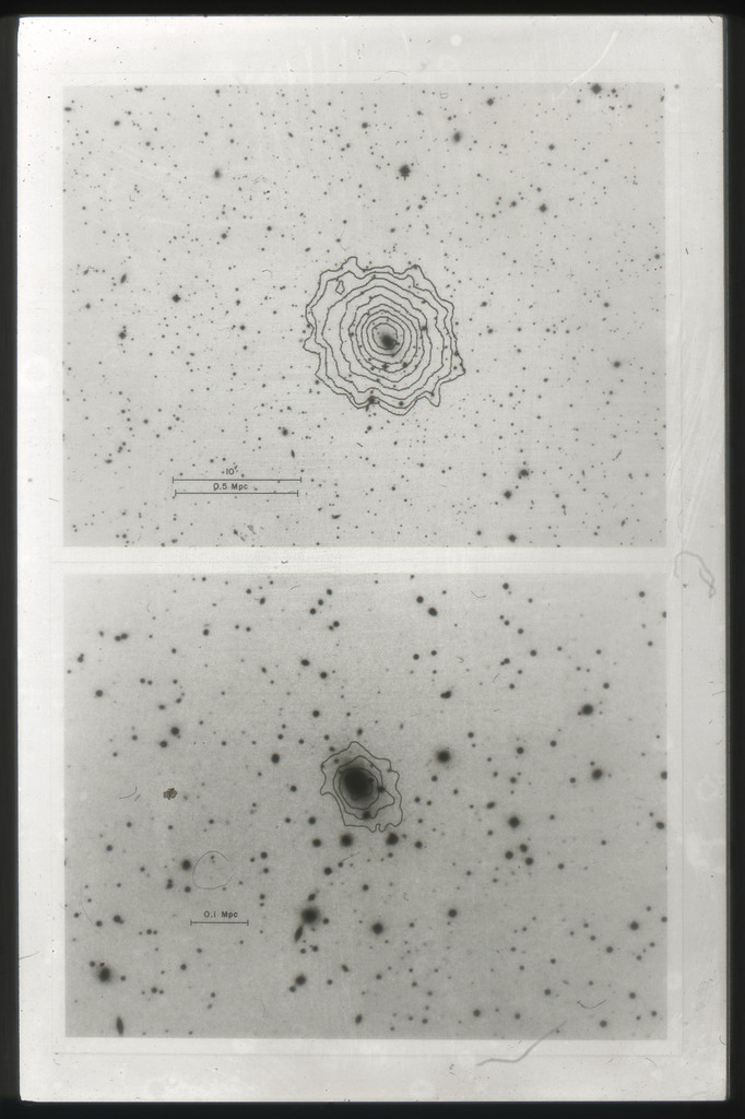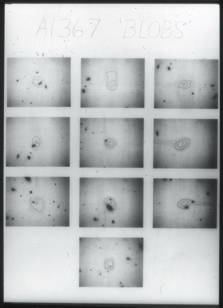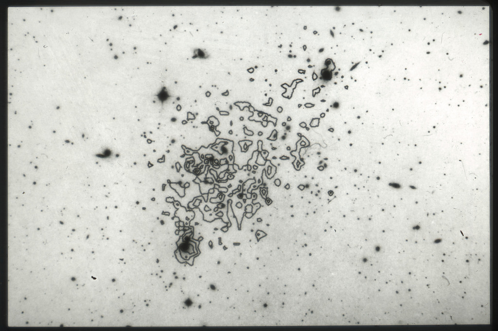 E/1003 A 1367. Optical picture of the cluster contains several hundred individual galaxies, the brightest of which are seen as the extended or fuzzy dark spots. |