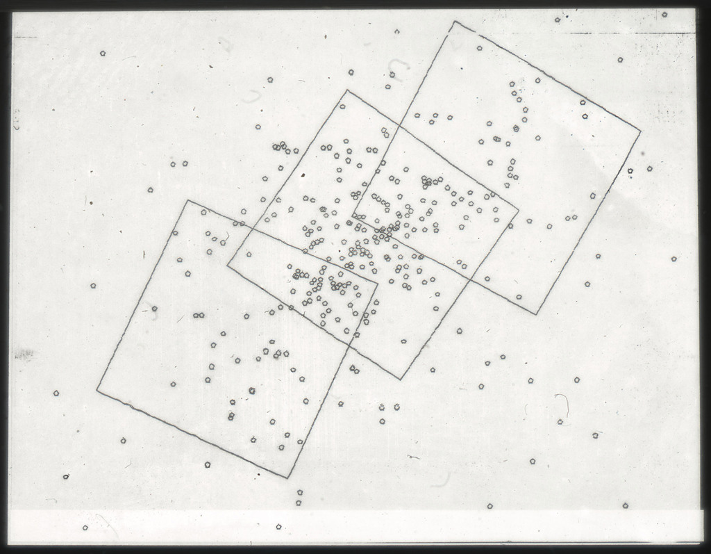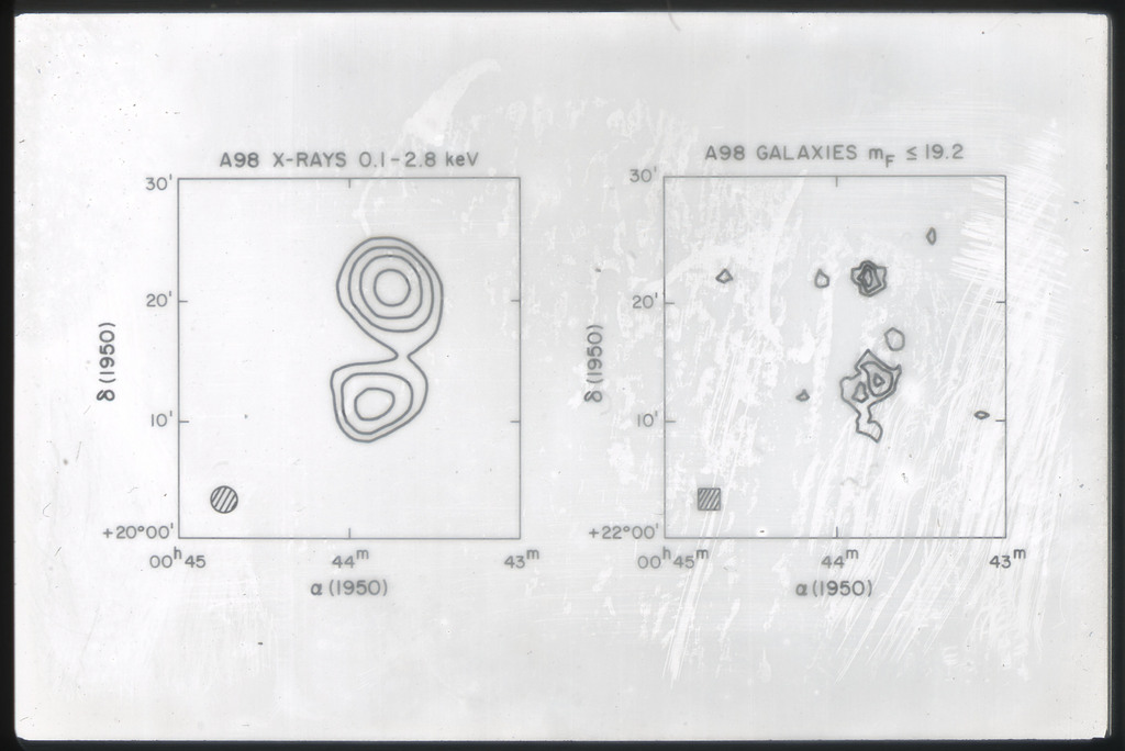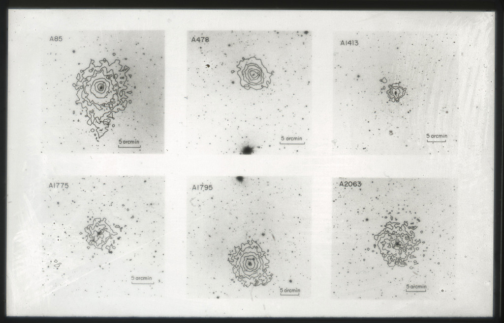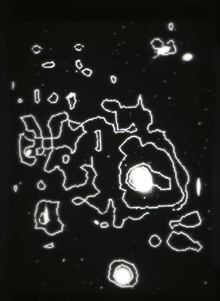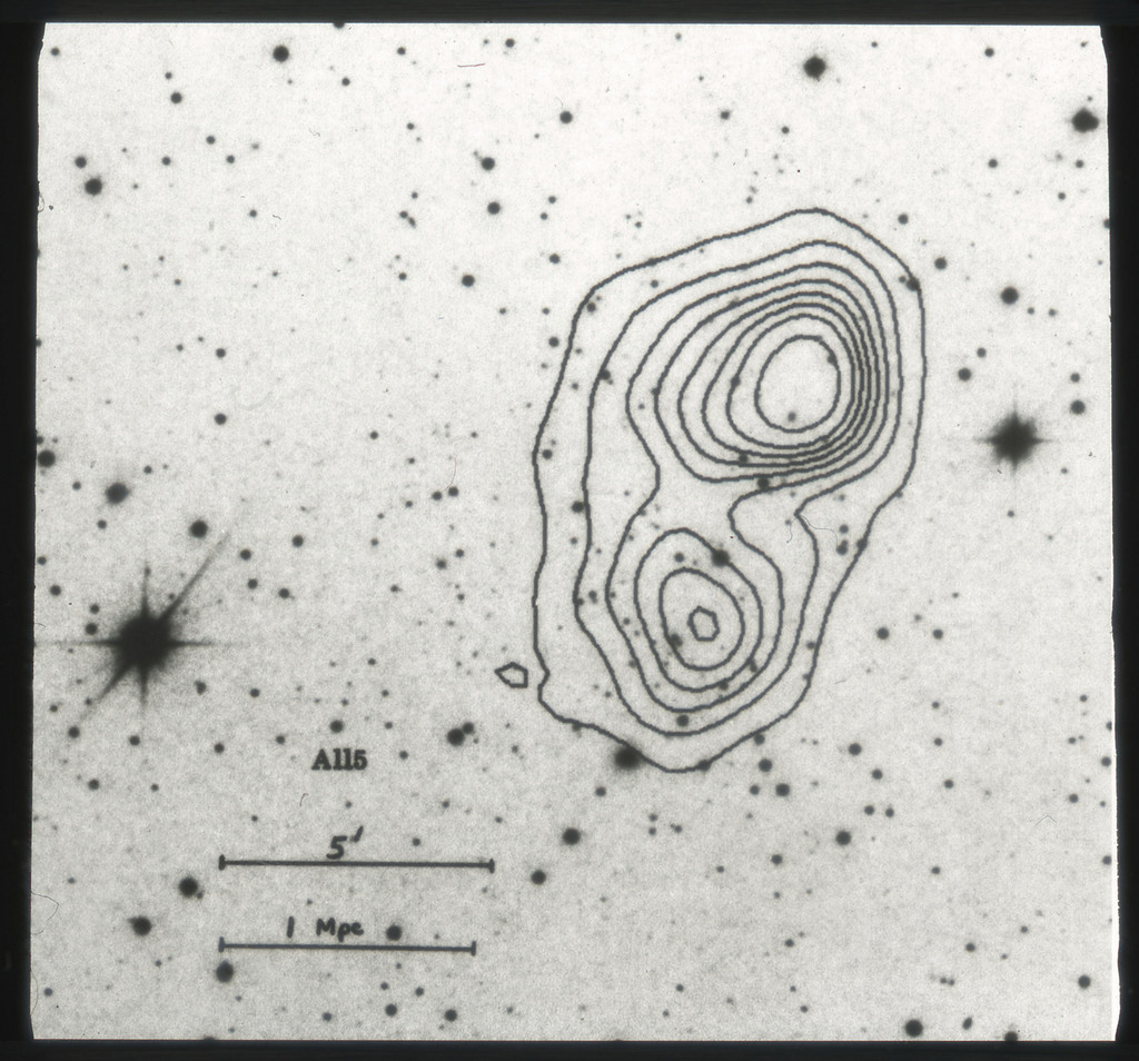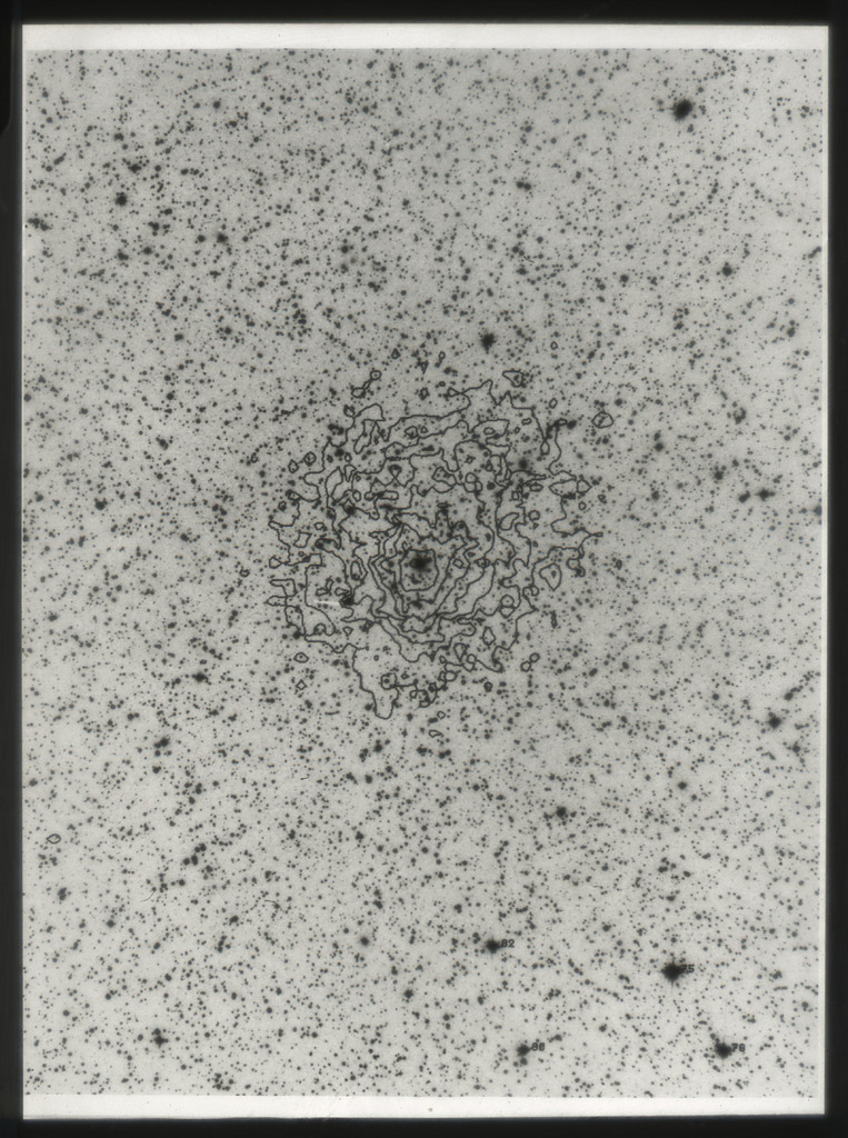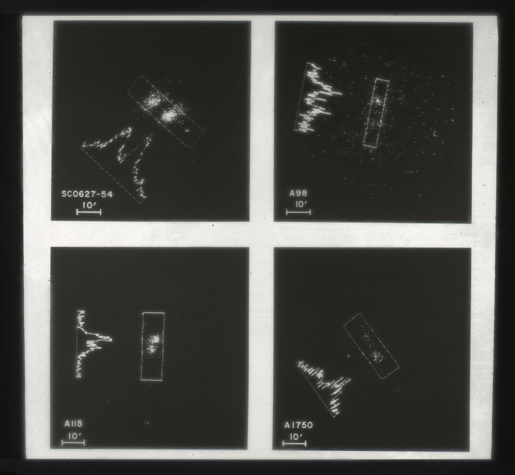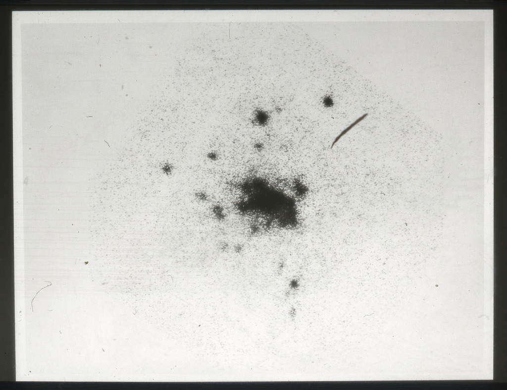 E/1003 A 1367. Optical picture of the cluster contains several hundred individual galaxies, the brightest of which are seen as the extended or fuzzy dark spots. |