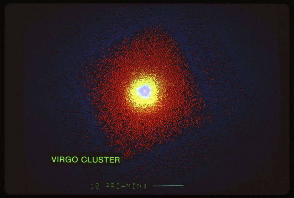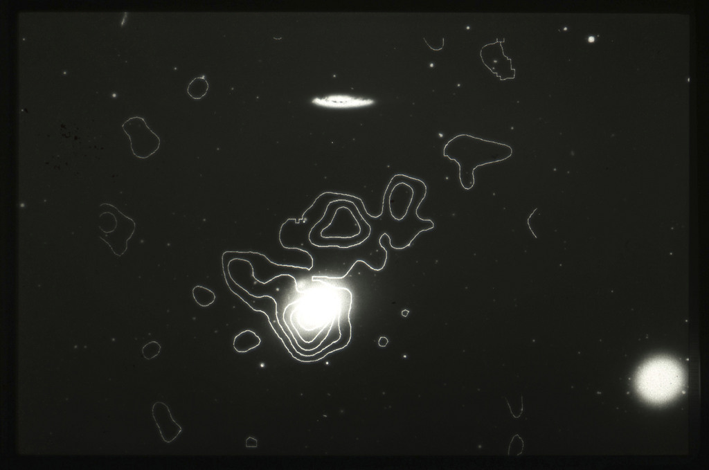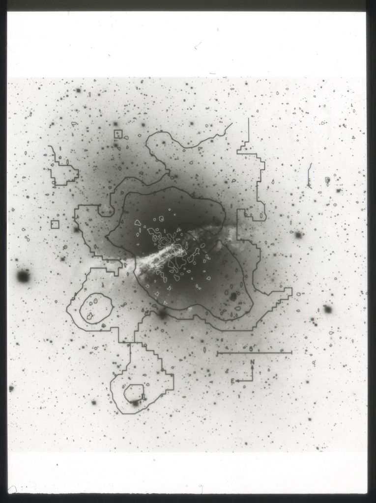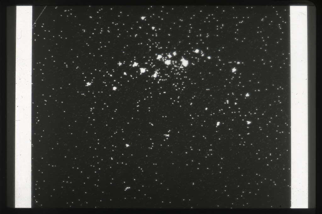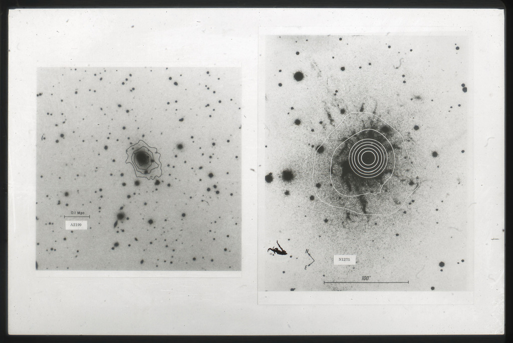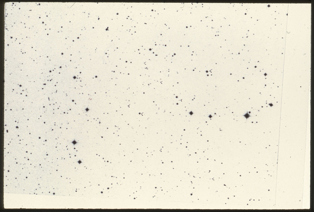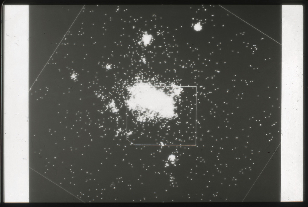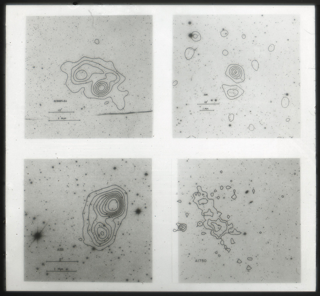 E/1003 A 1367. Optical picture of the cluster contains several hundred individual galaxies, the brightest of which are seen as the extended or fuzzy dark spots. |