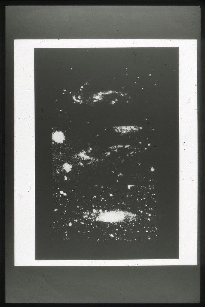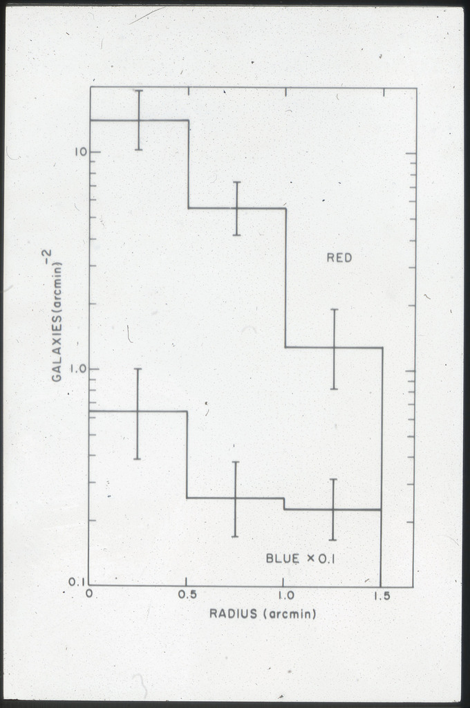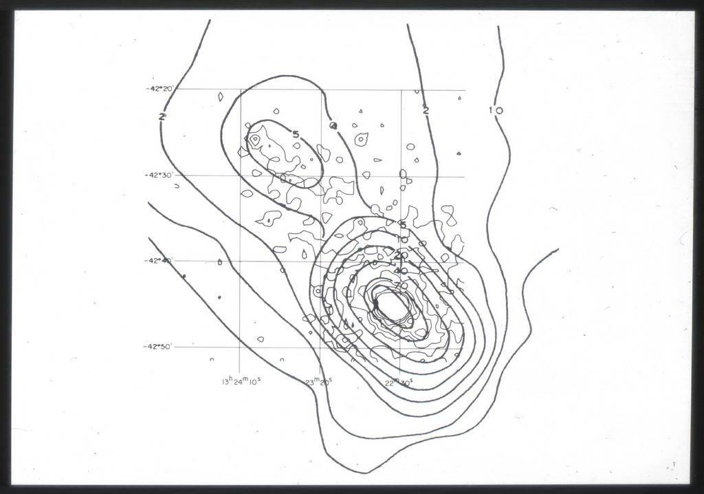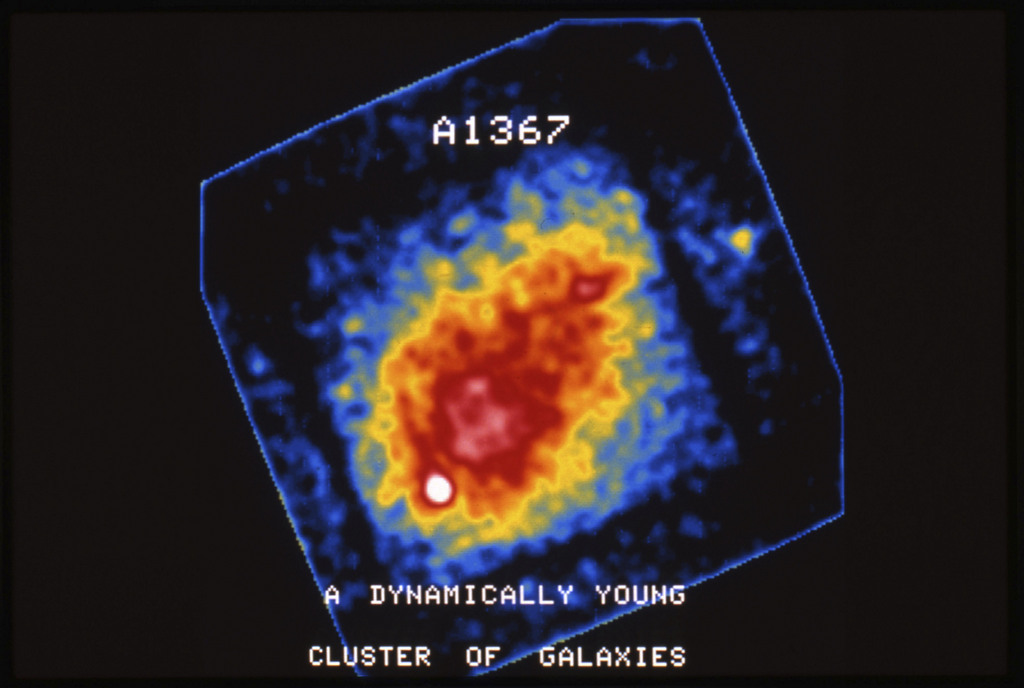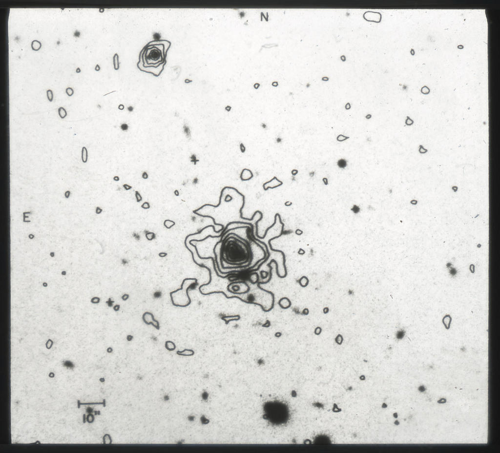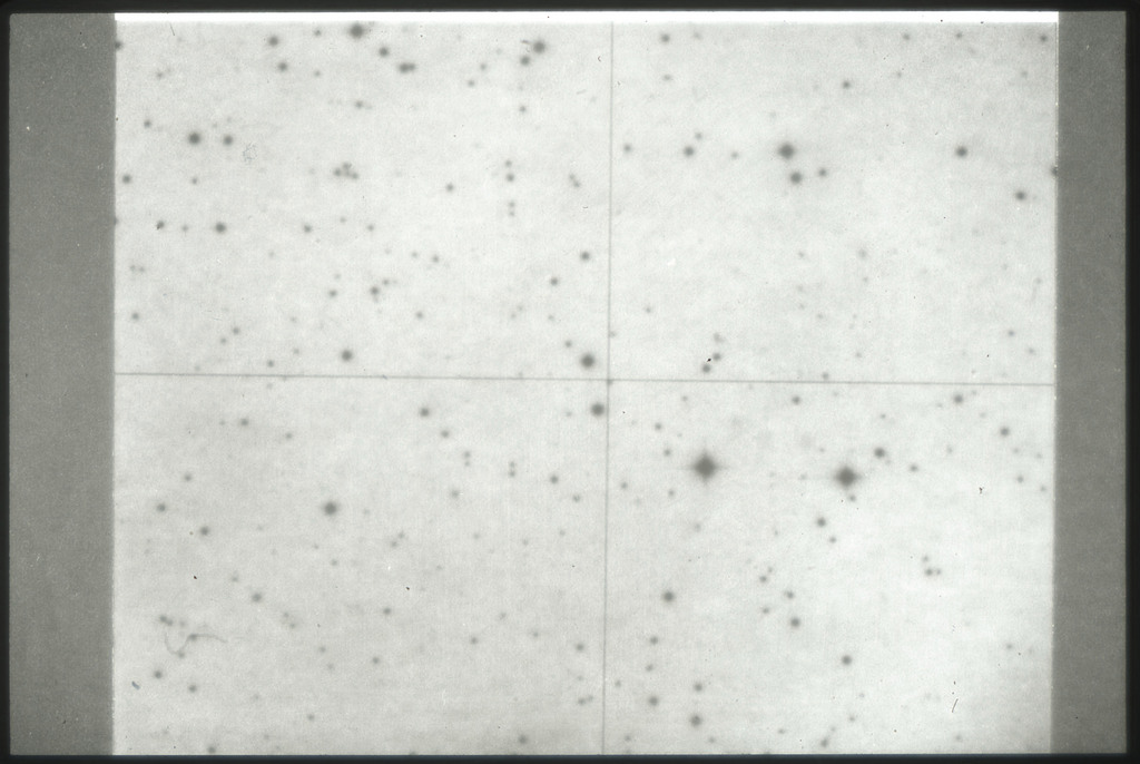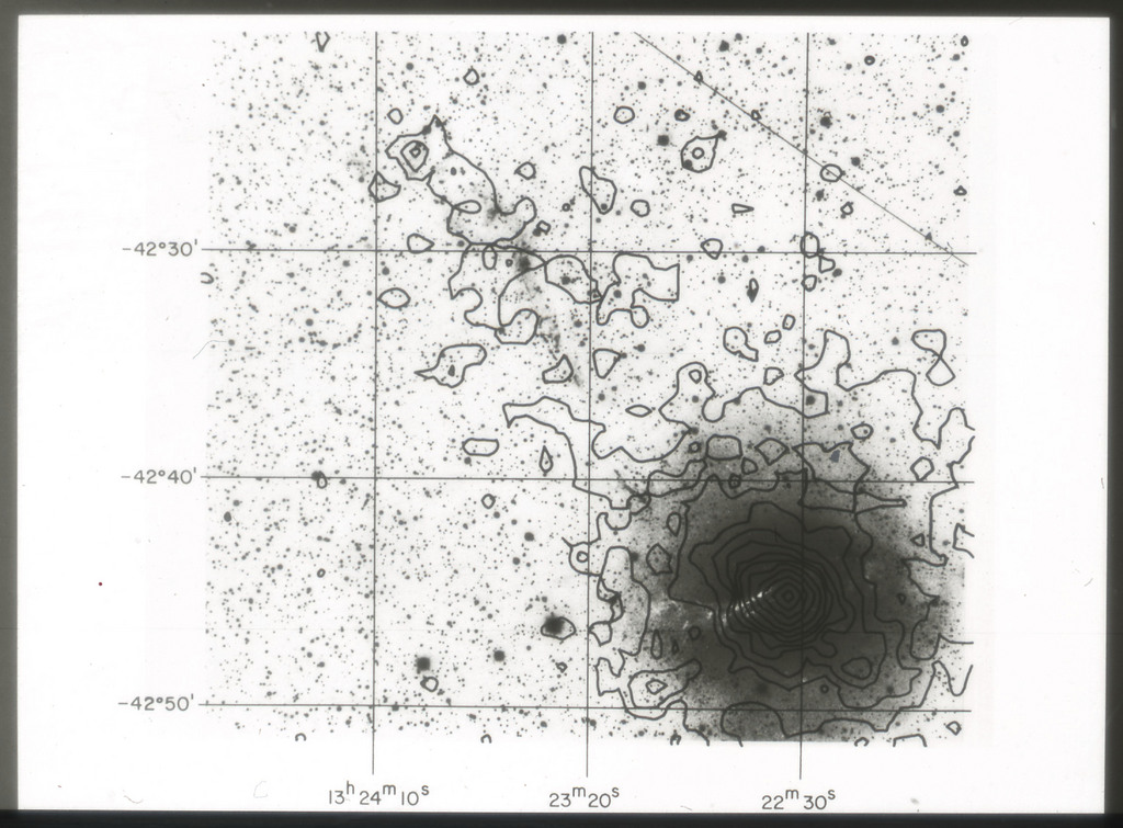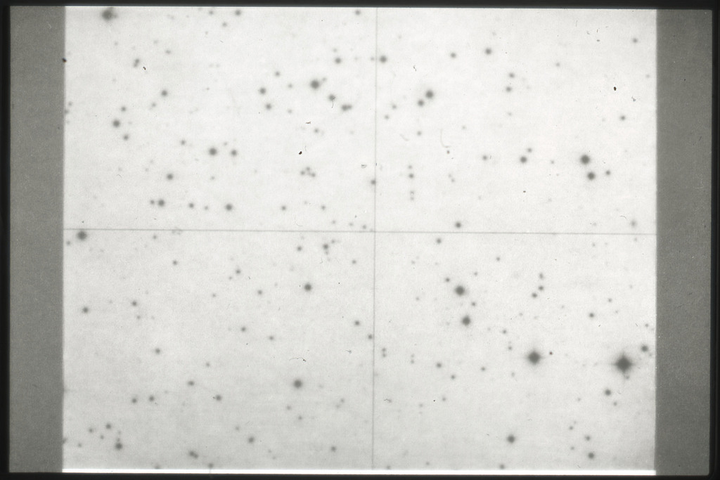 E/1003 A 1367. Optical picture of the cluster contains several hundred individual galaxies, the brightest of which are seen as the extended or fuzzy dark spots. |