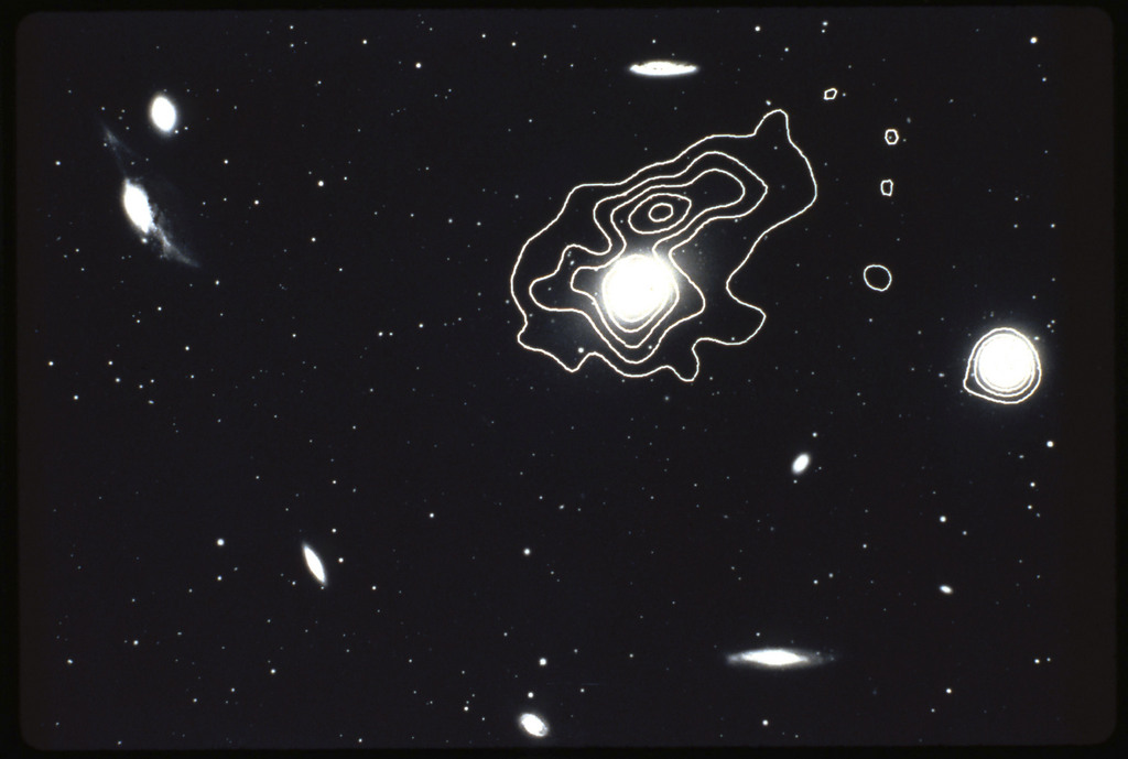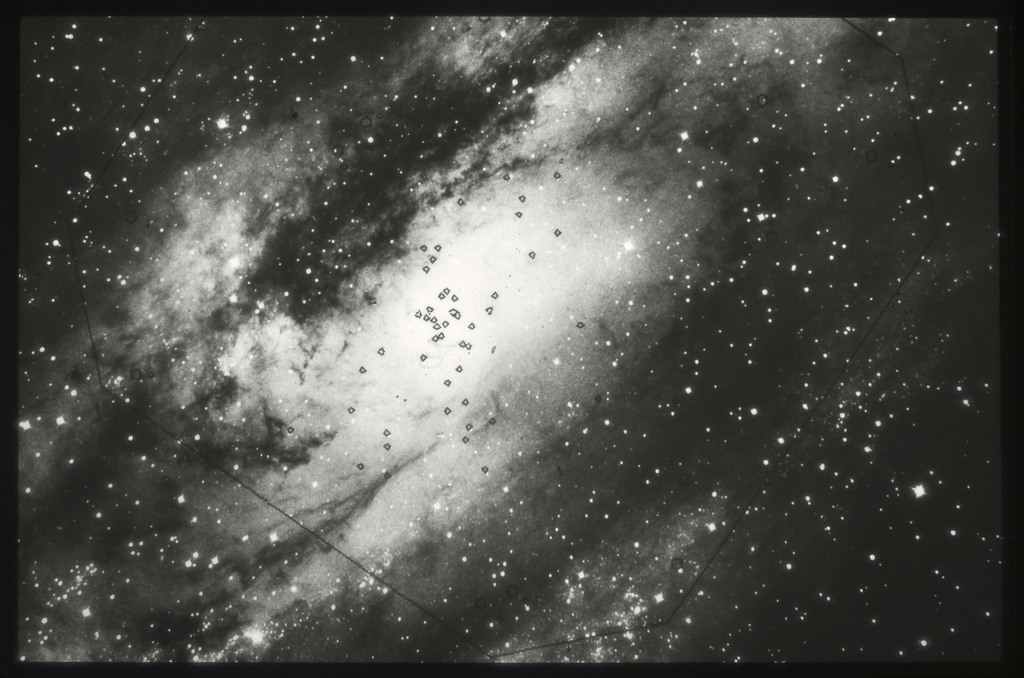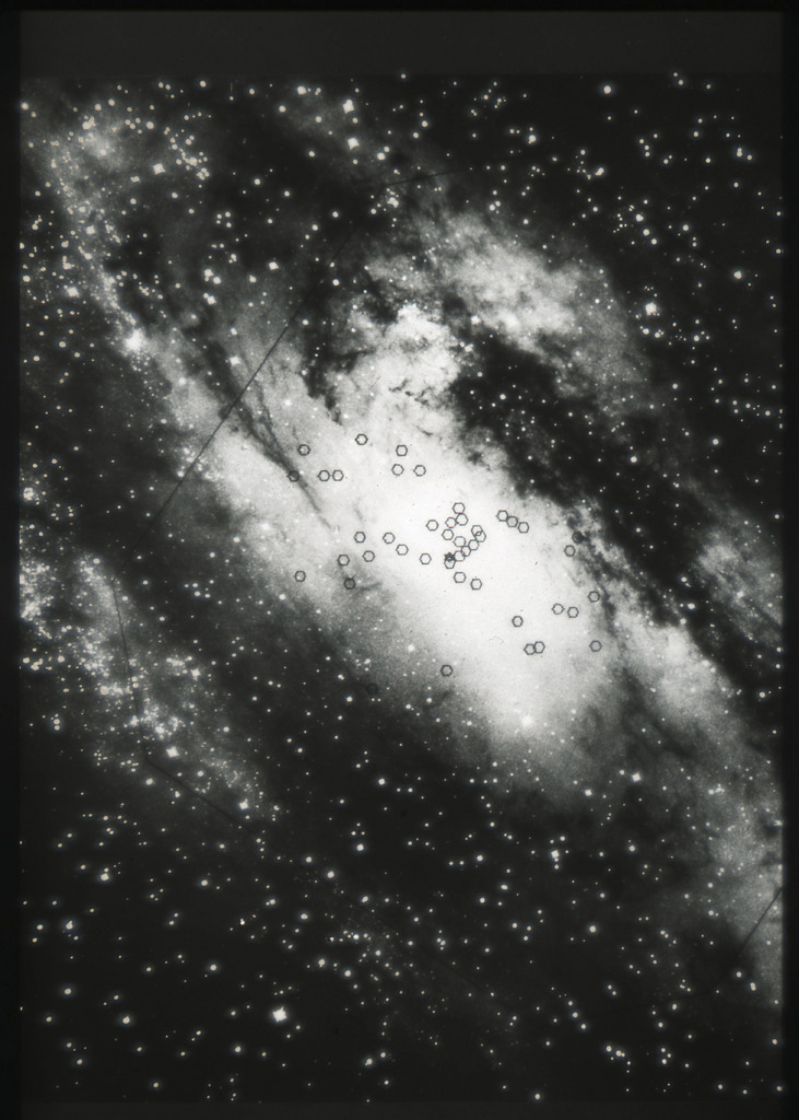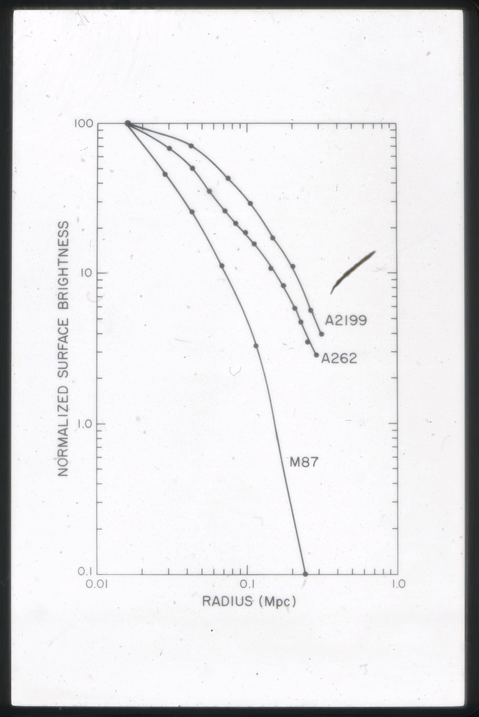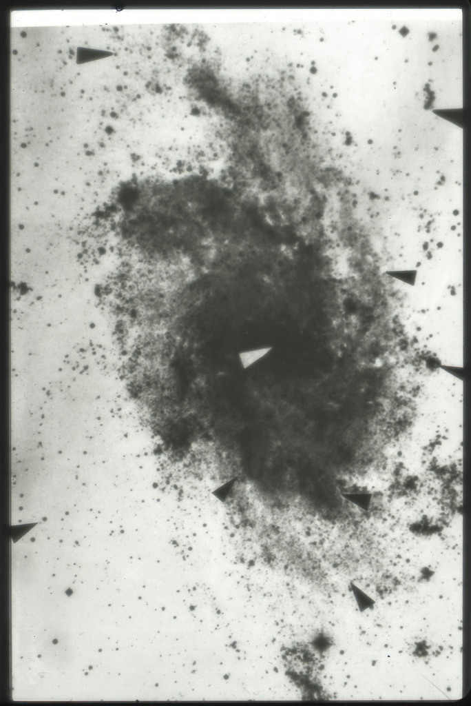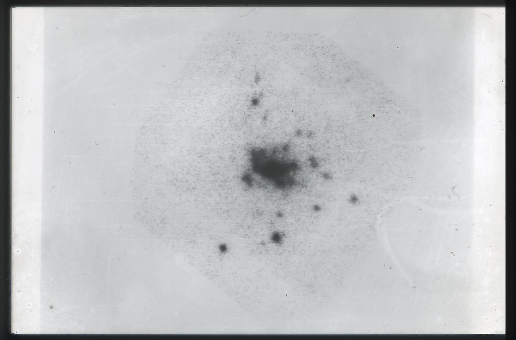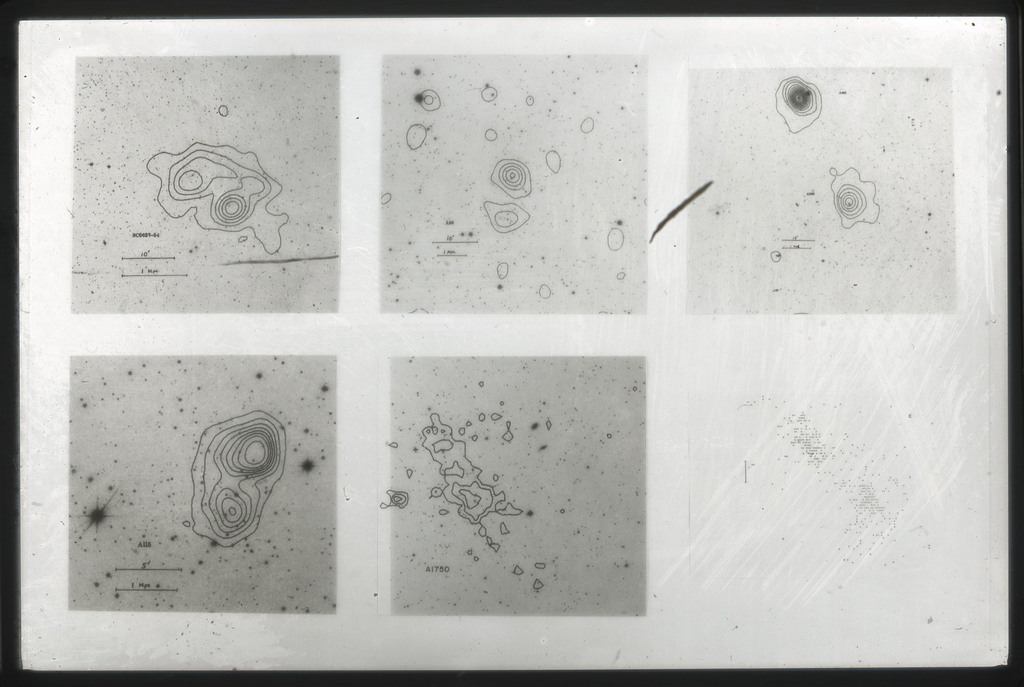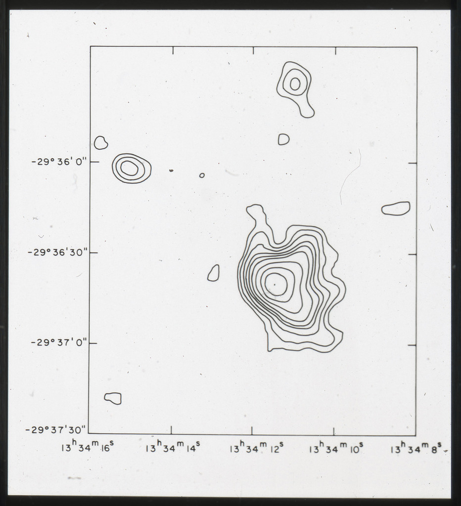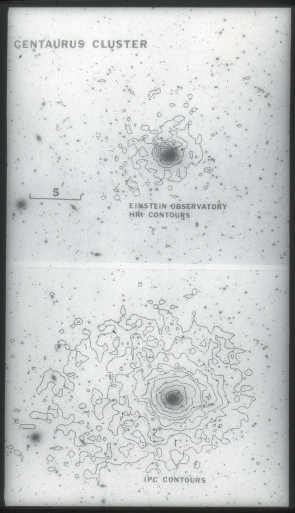E/1003 A 1367. Optical picture of the cluster contains several hundred individual galaxies, the brightest of which are seen as the extended or fuzzy dark spots. |