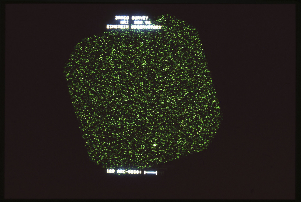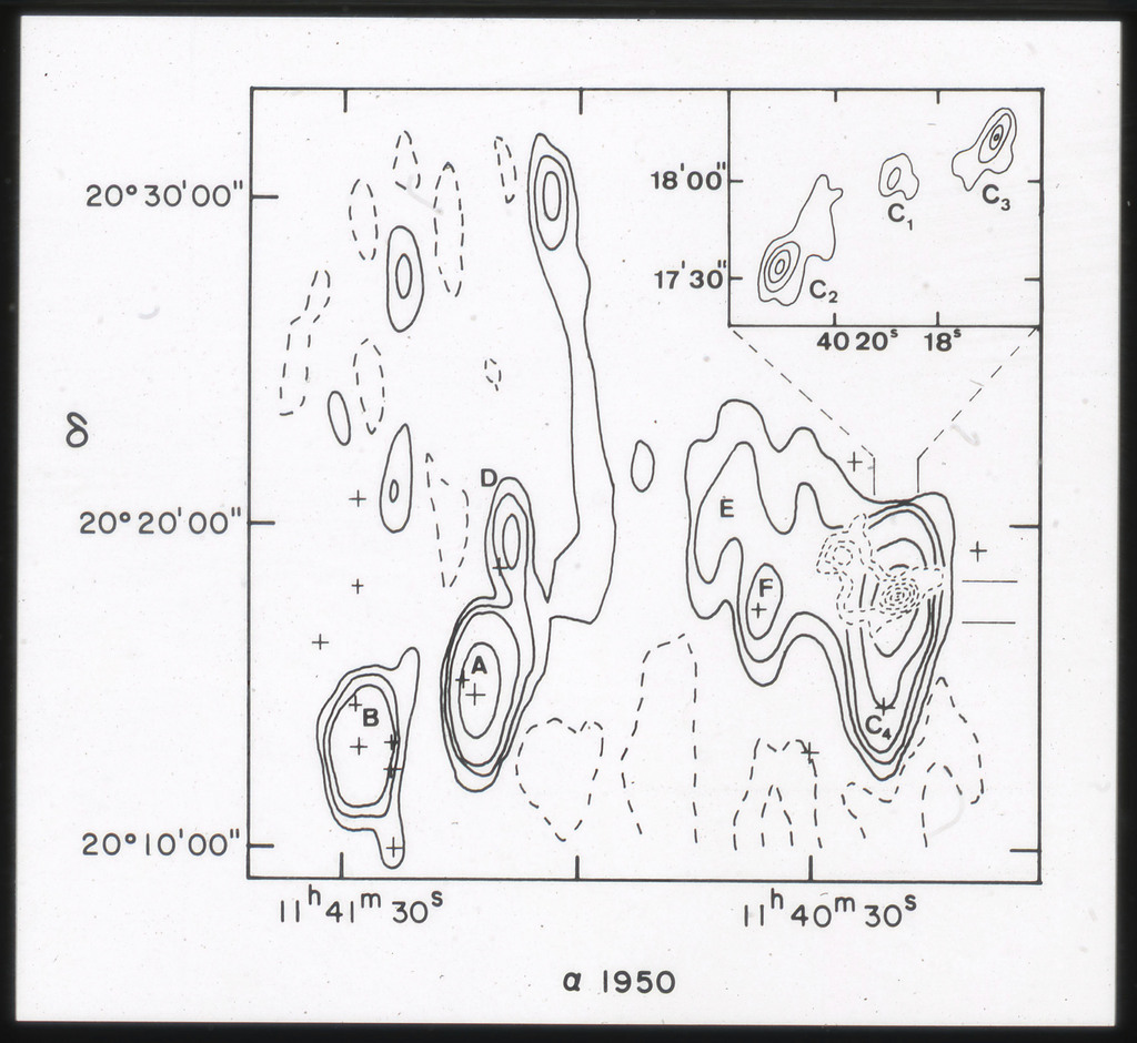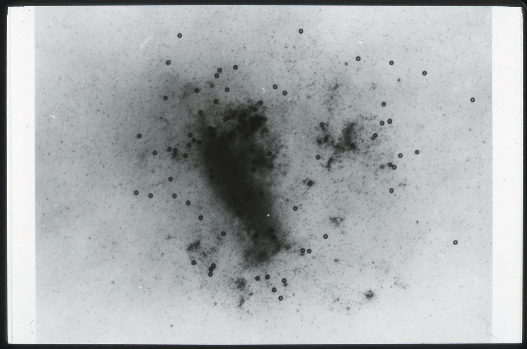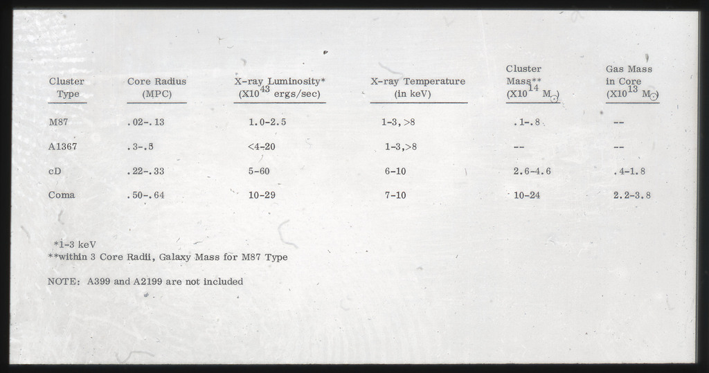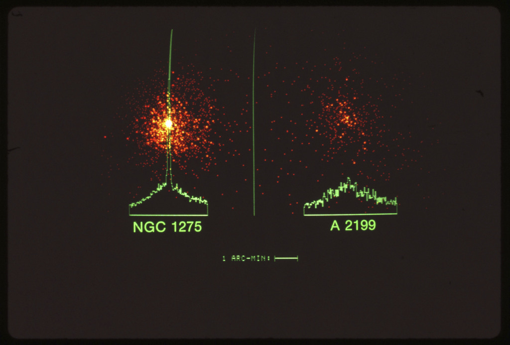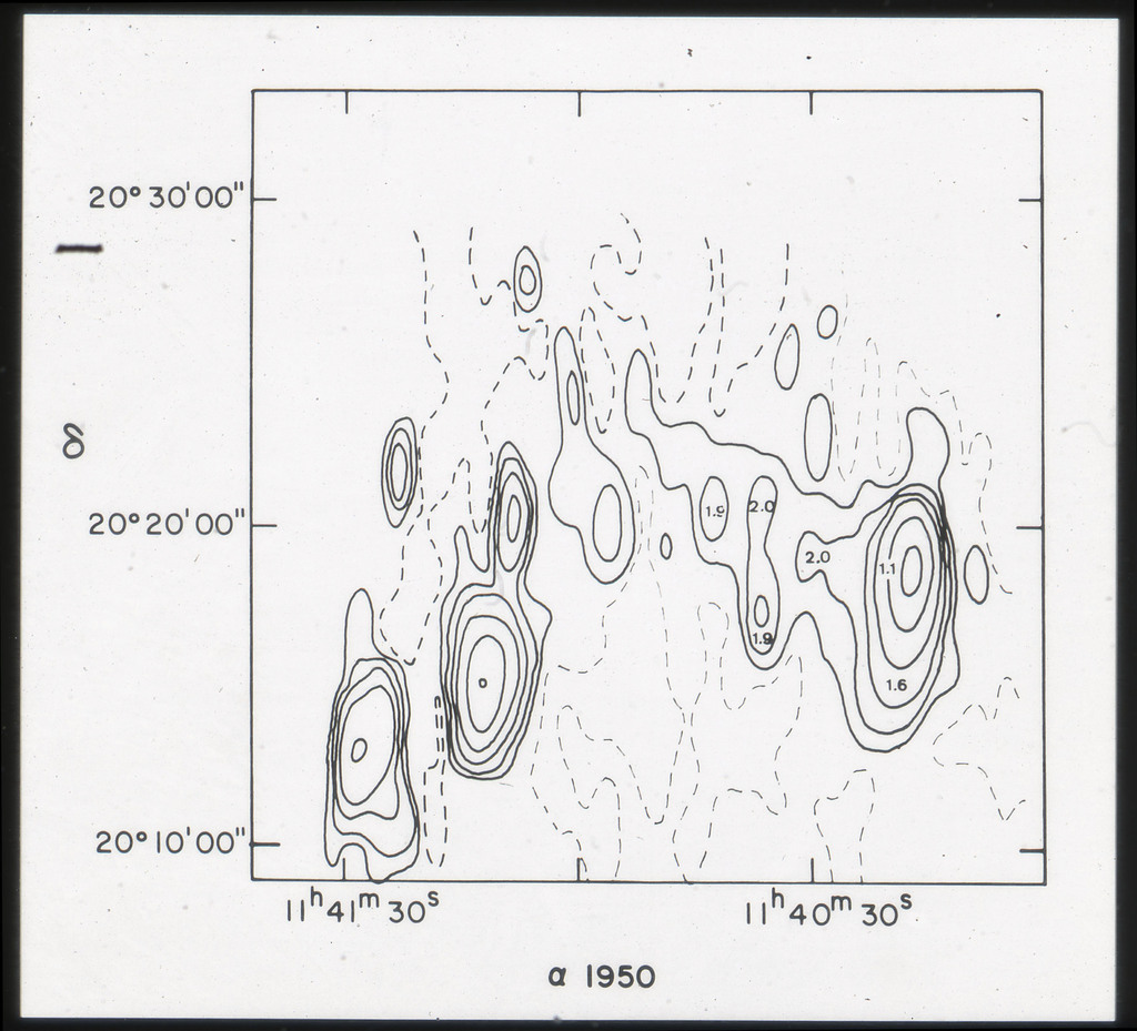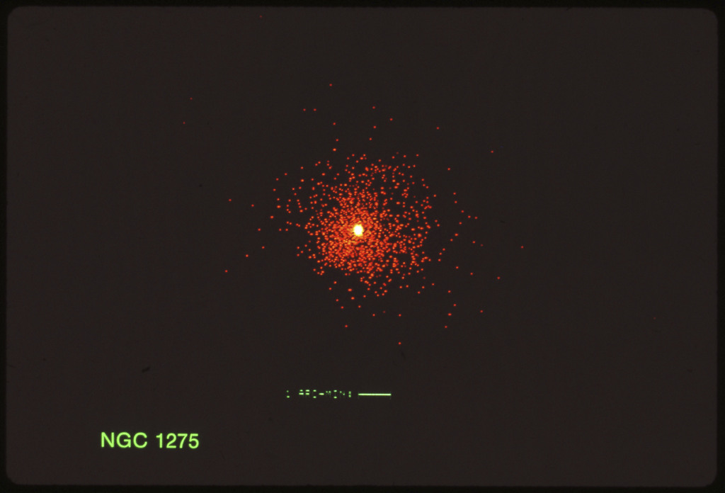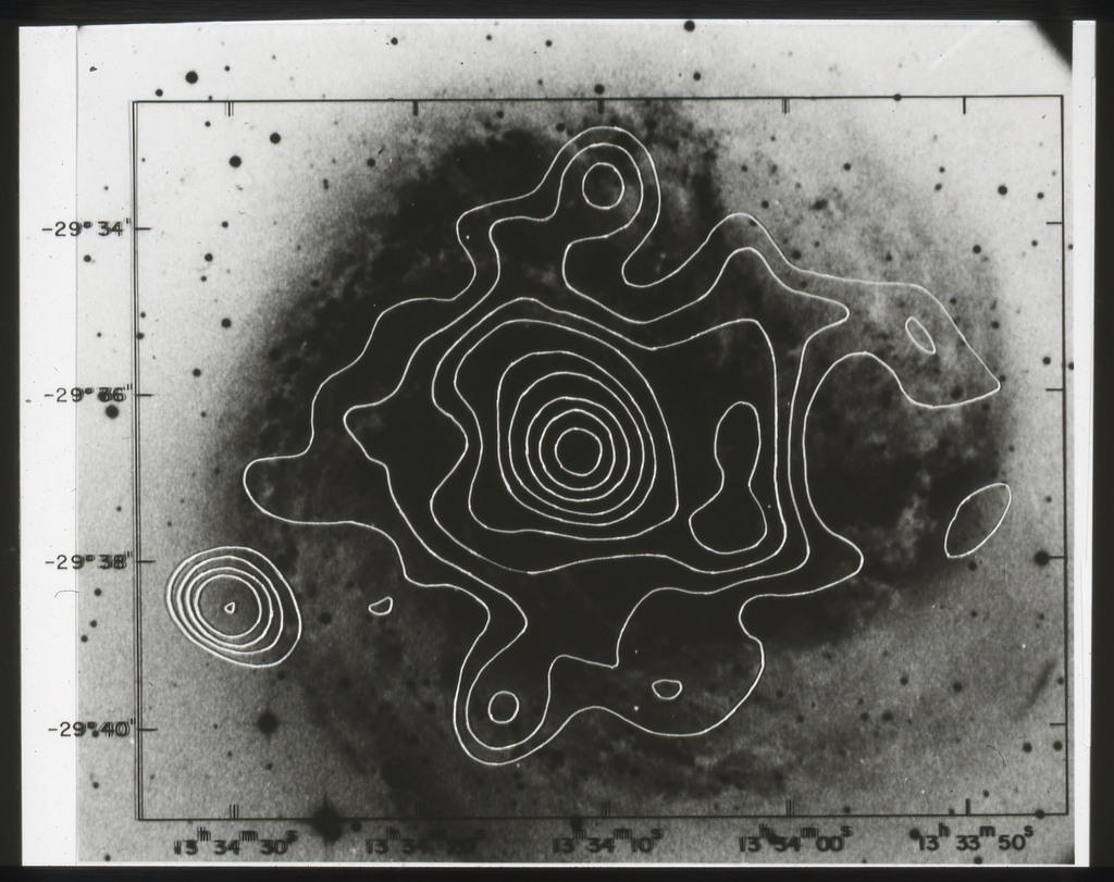 E/1003 A 1367. Optical picture of the cluster contains several hundred individual galaxies, the brightest of which are seen as the extended or fuzzy dark spots. |
