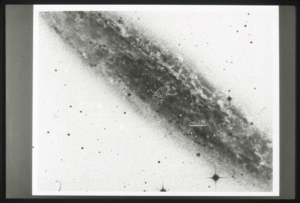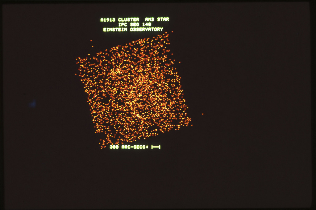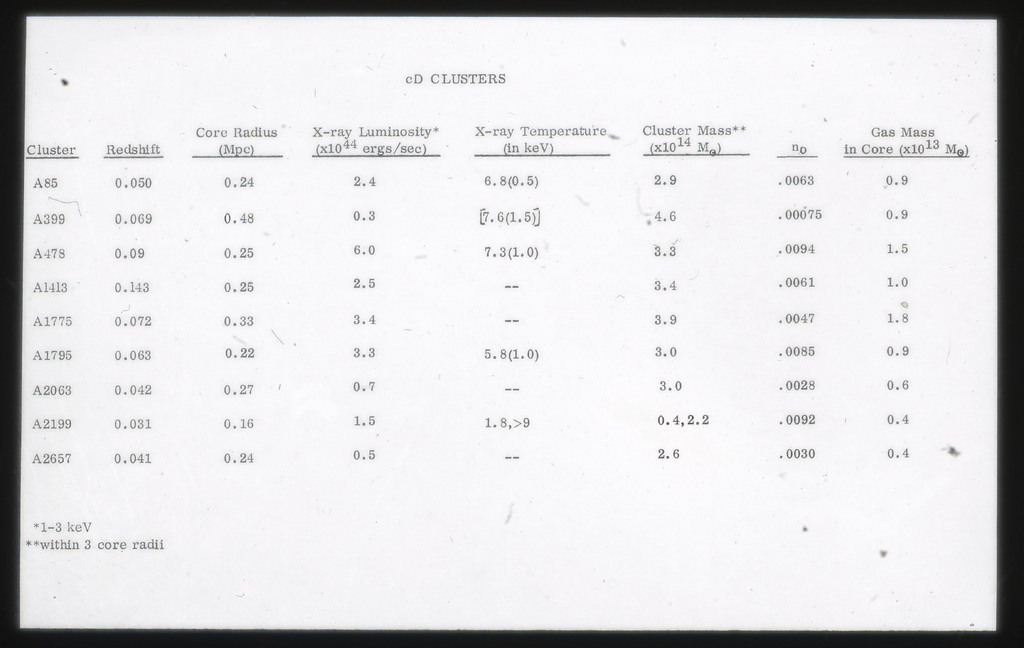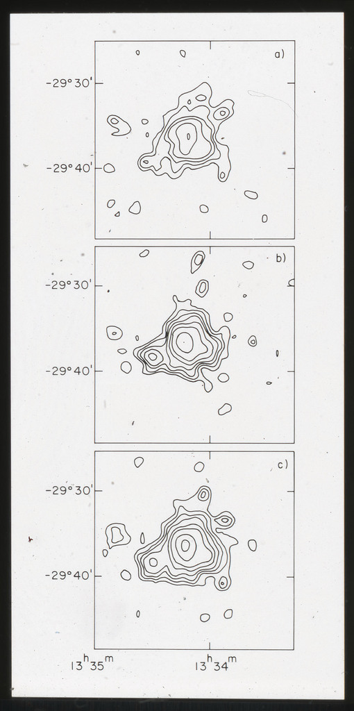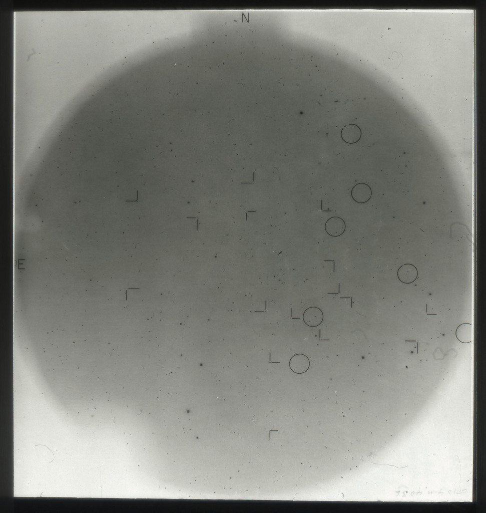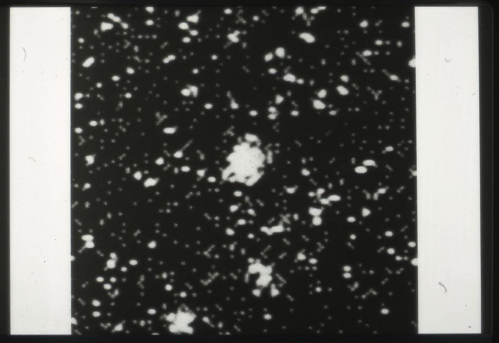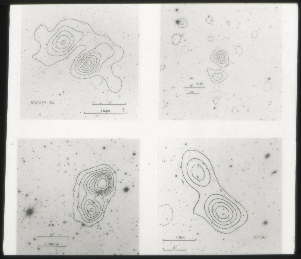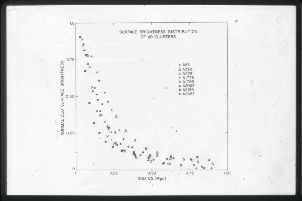 E/1003 A 1367. Optical picture of the cluster contains several hundred individual galaxies, the brightest of which are seen as the extended or fuzzy dark spots. |