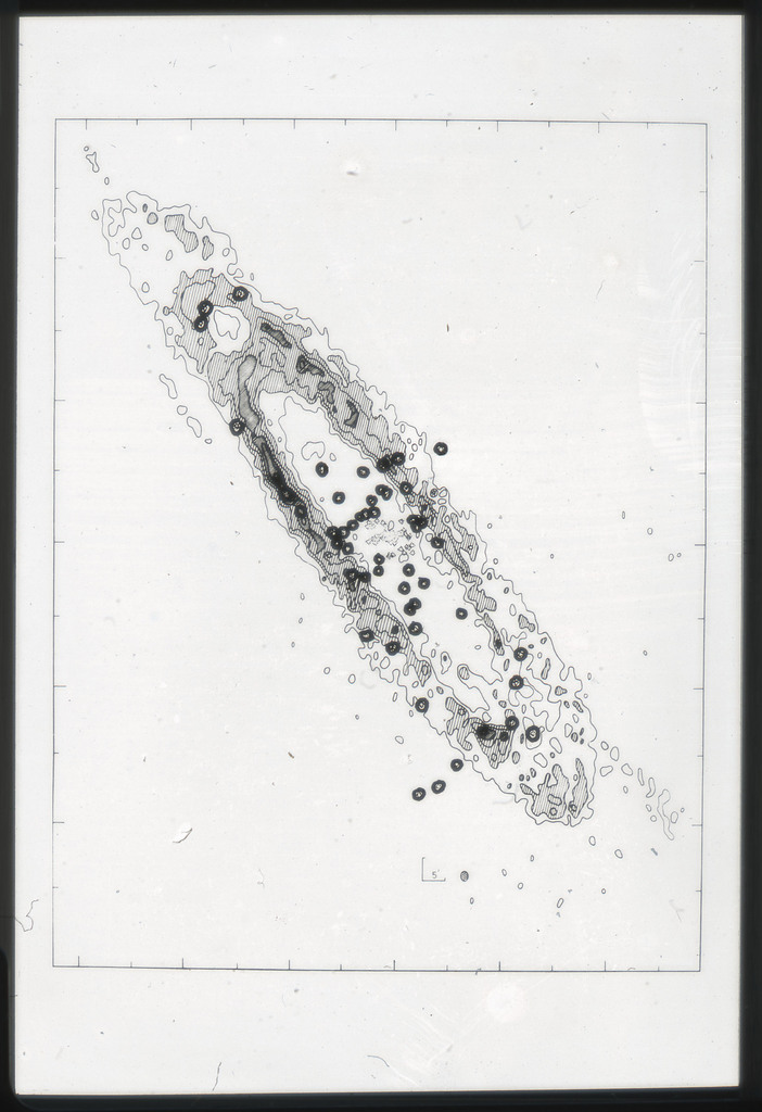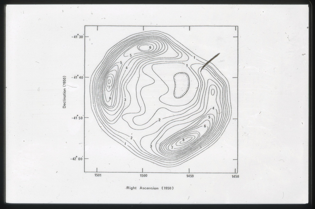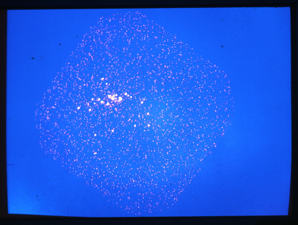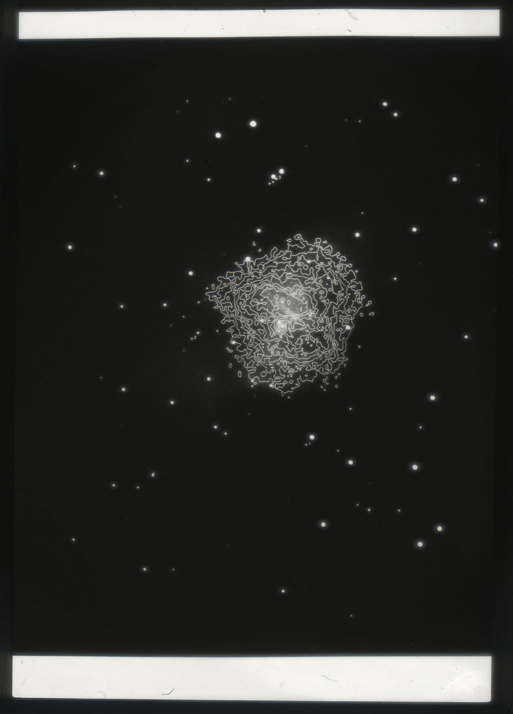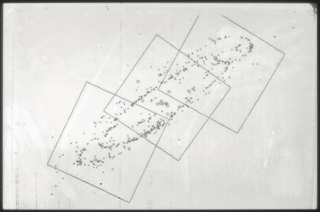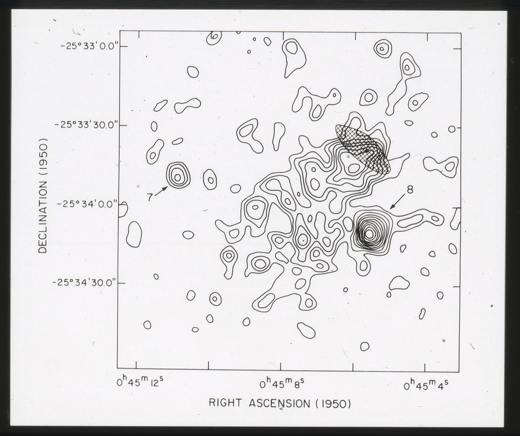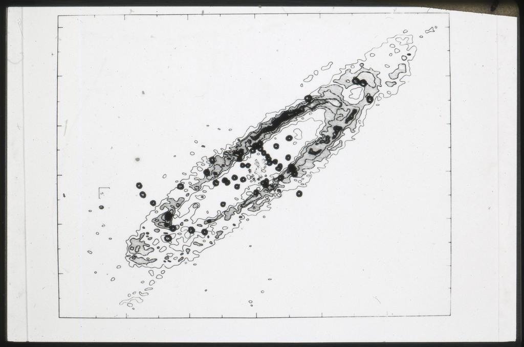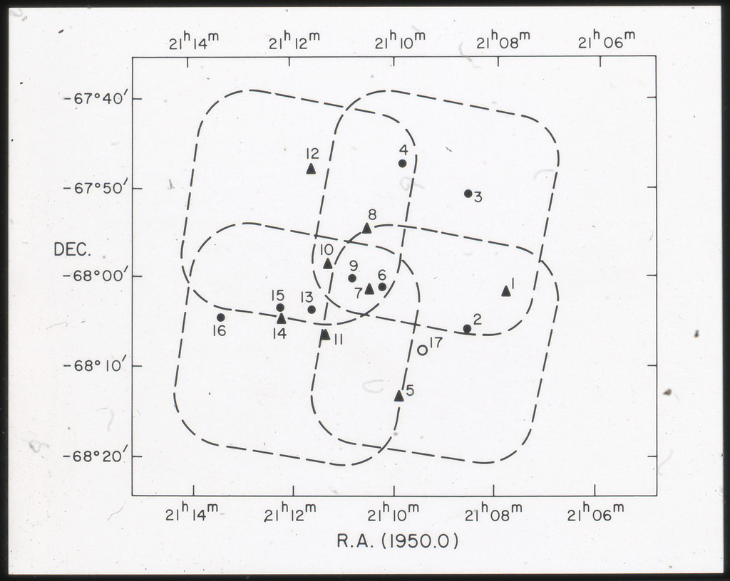 E/1003 A 1367. Optical picture of the cluster contains several hundred individual galaxies, the brightest of which are seen as the extended or fuzzy dark spots. |