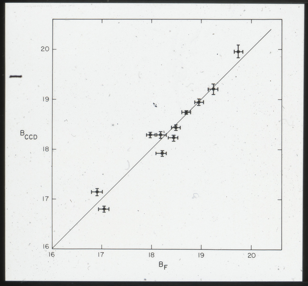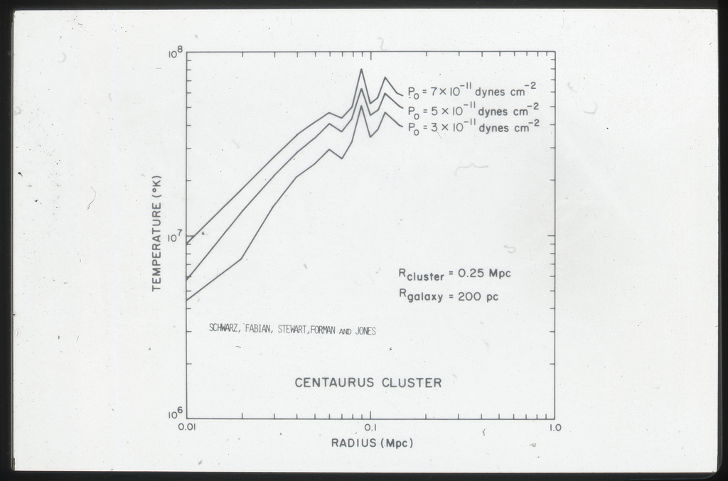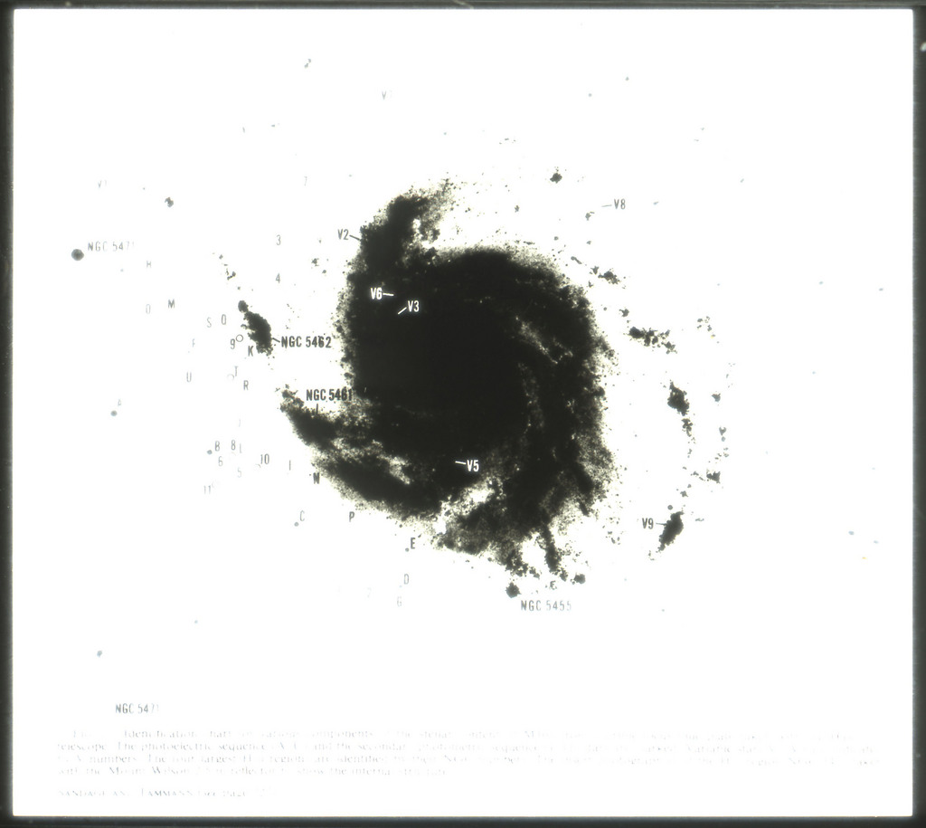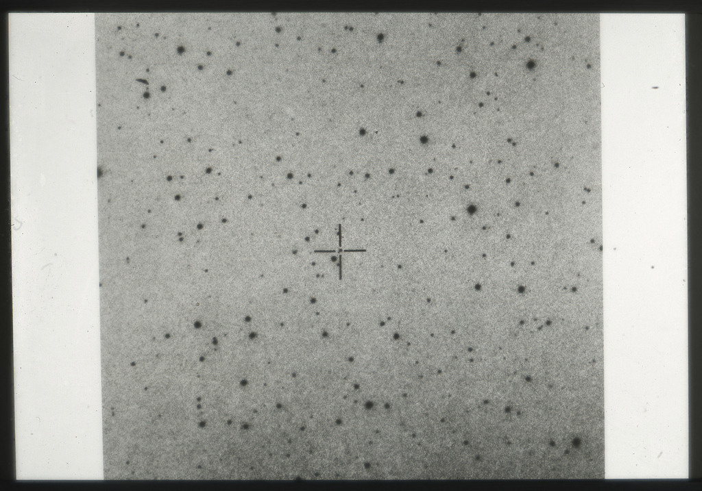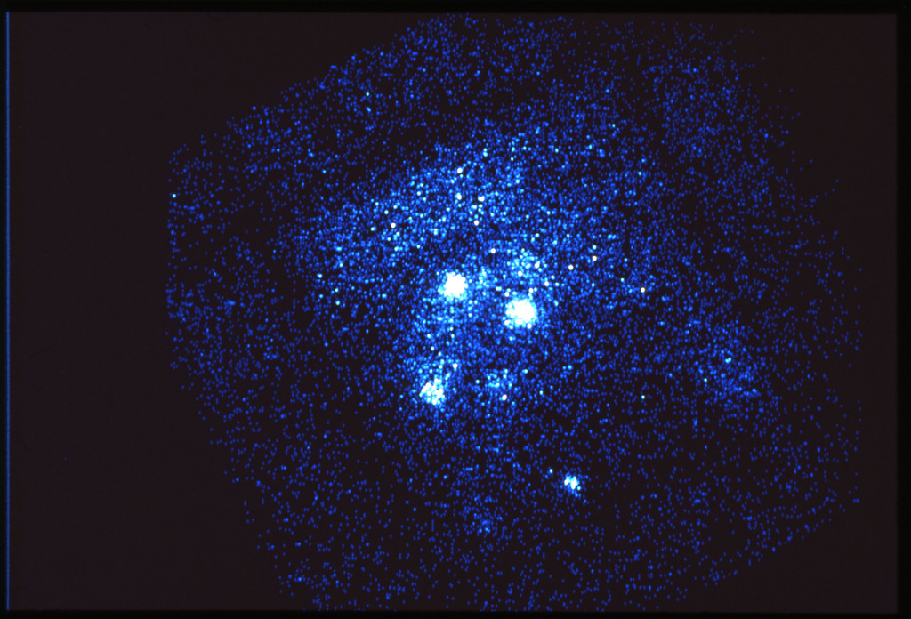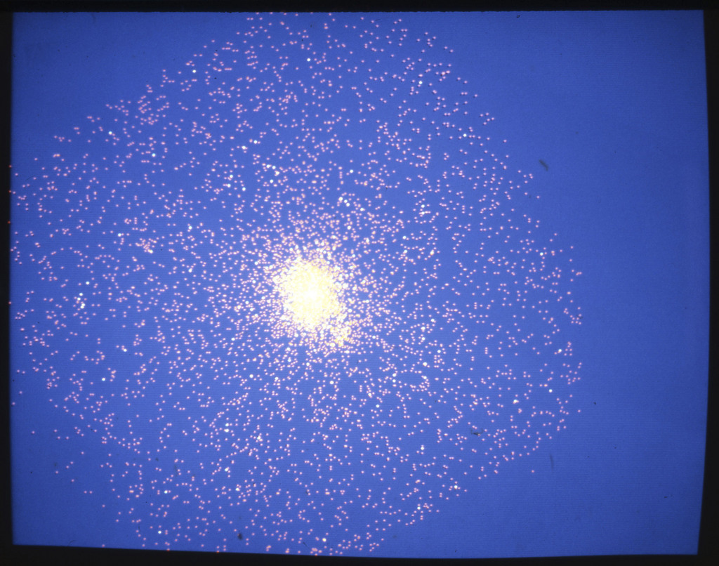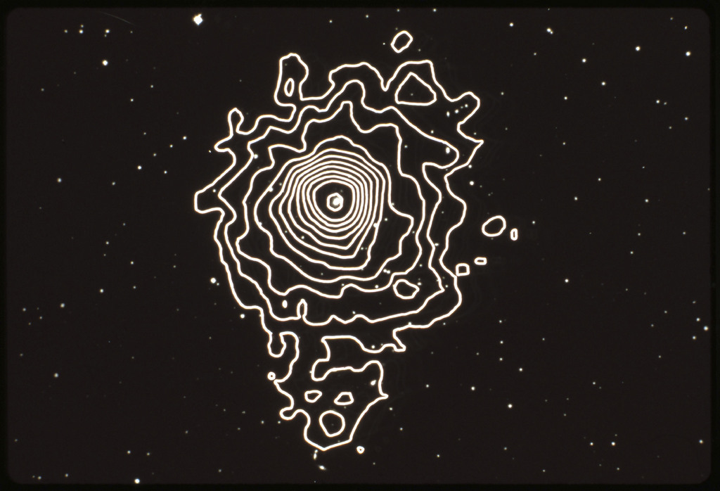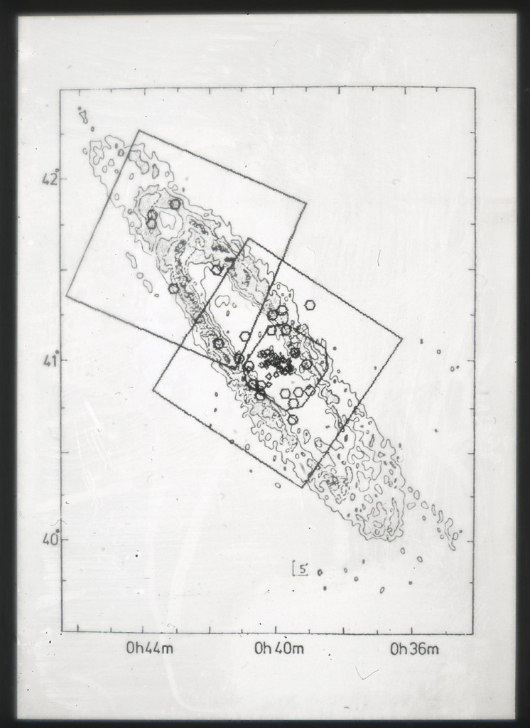 E/1003 A 1367. Optical picture of the cluster contains several hundred individual galaxies, the brightest of which are seen as the extended or fuzzy dark spots. |