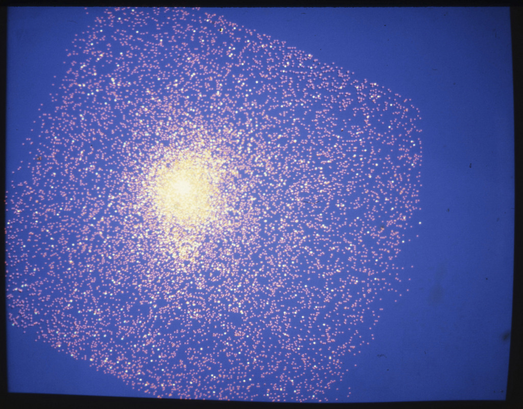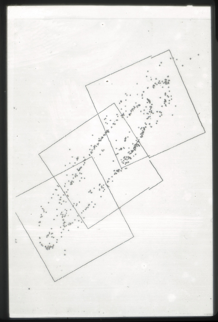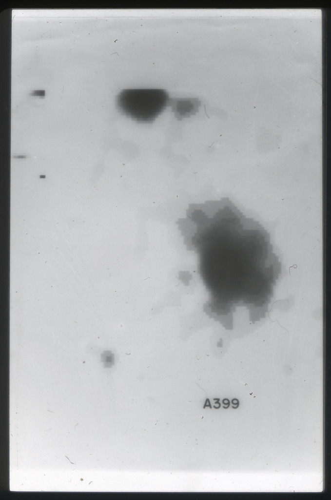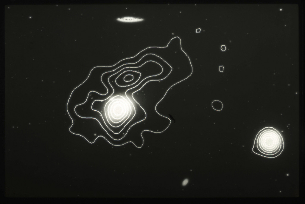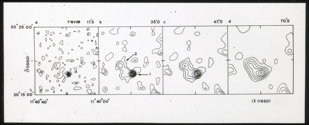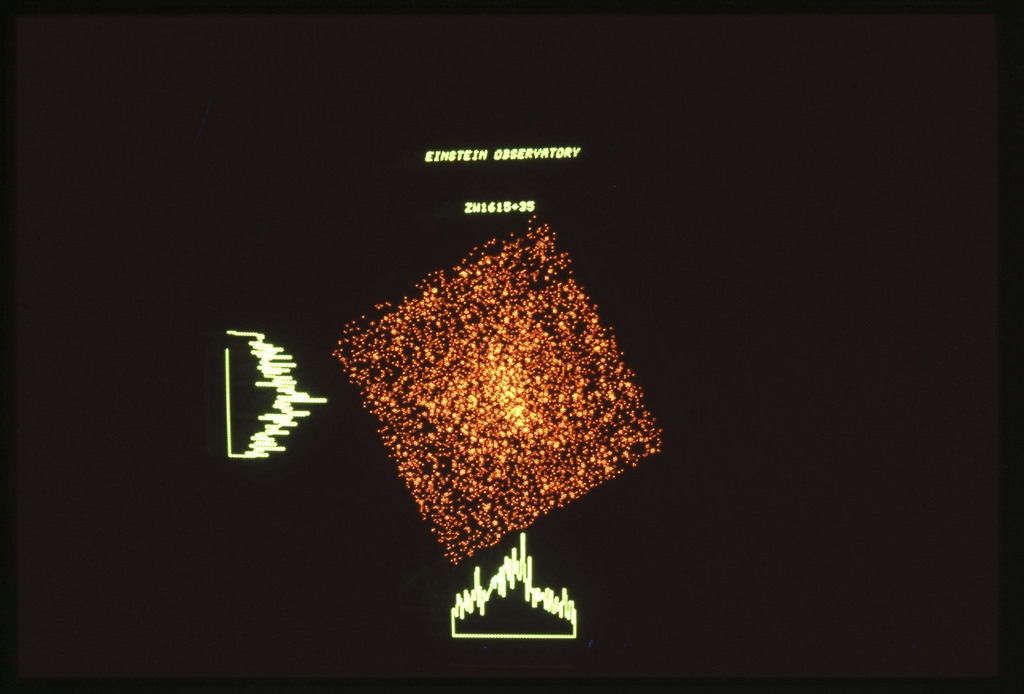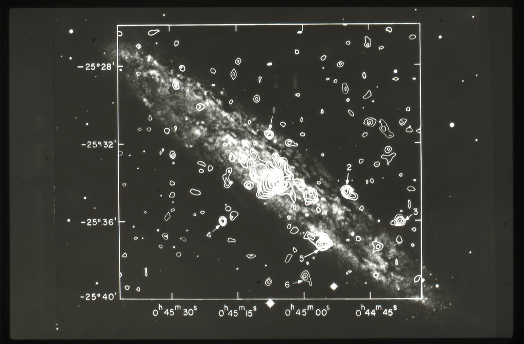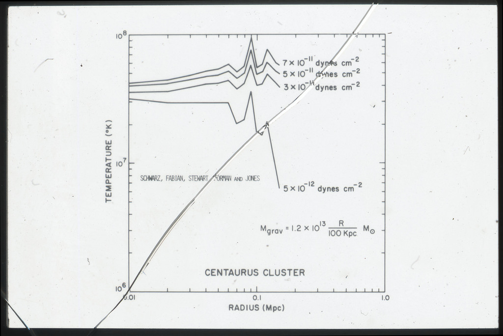 E/1003 A 1367. Optical picture of the cluster contains several hundred individual galaxies, the brightest of which are seen as the extended or fuzzy dark spots. |