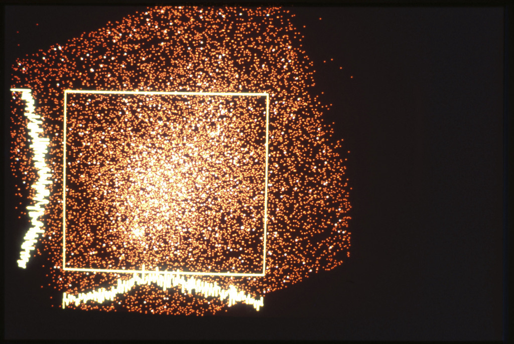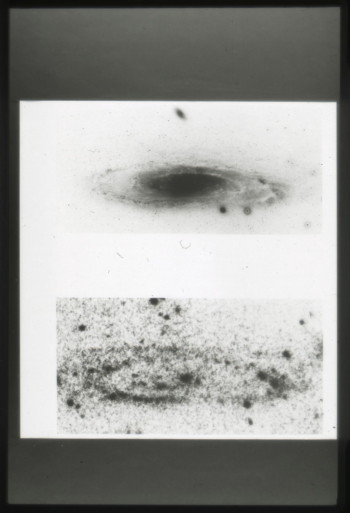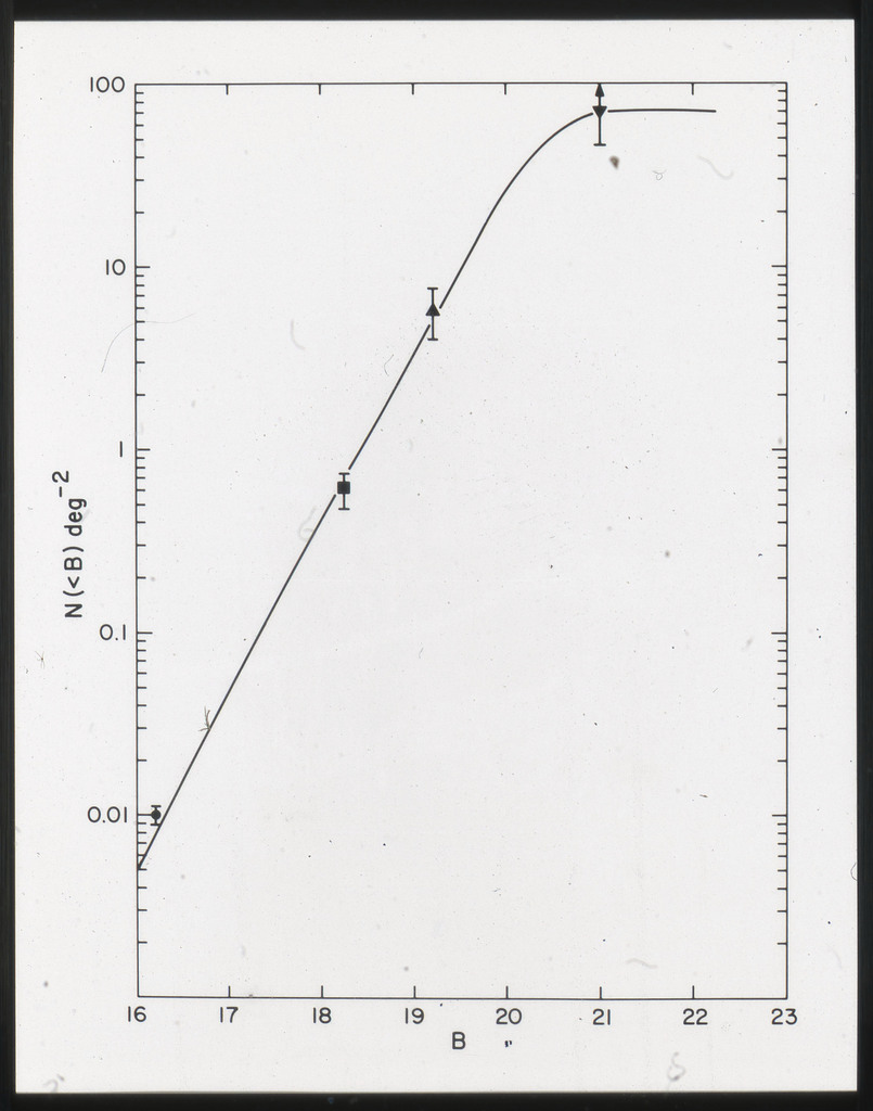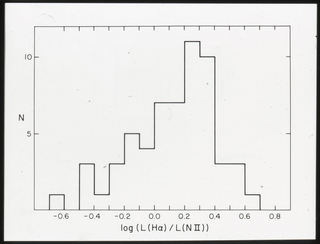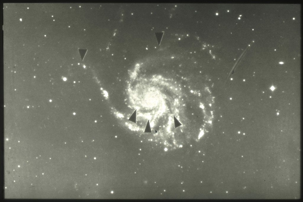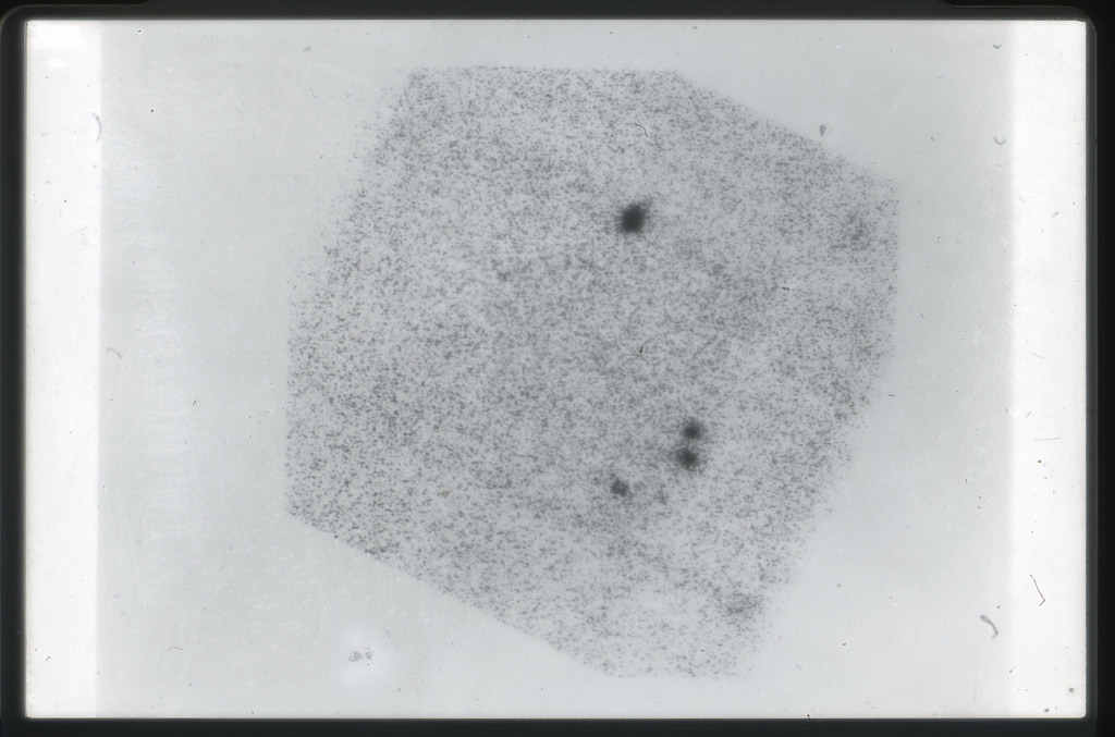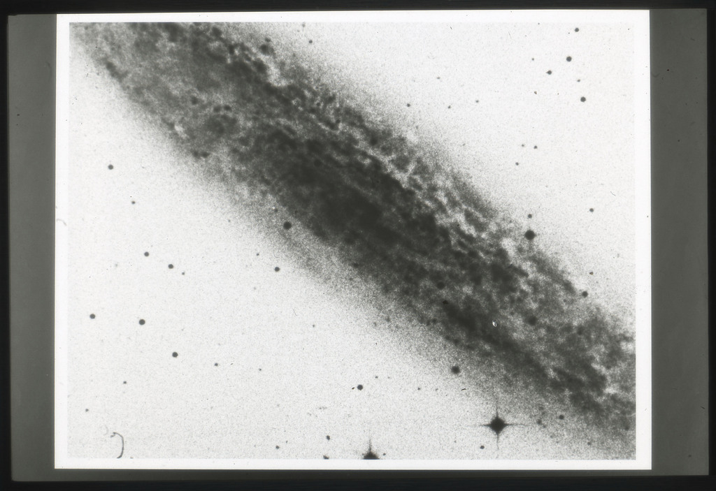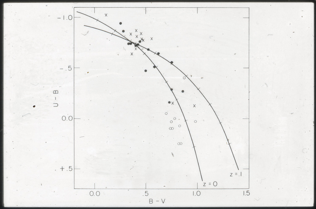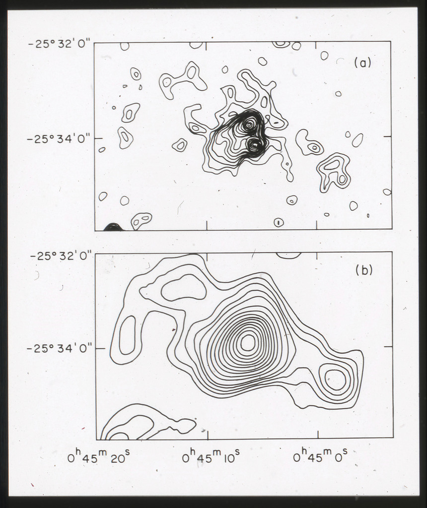 E/1003 A 1367. Optical picture of the cluster contains several hundred individual galaxies, the brightest of which are seen as the extended or fuzzy dark spots. |