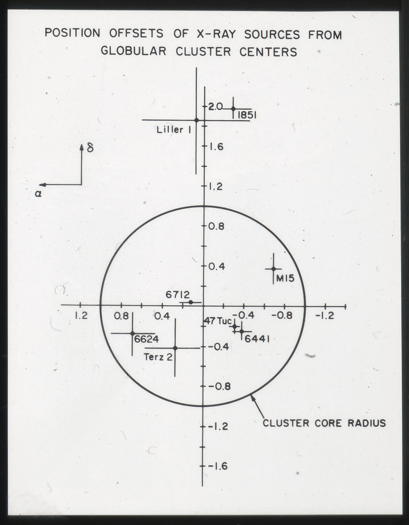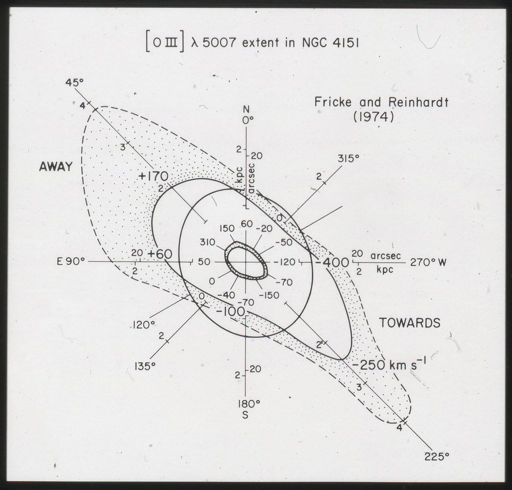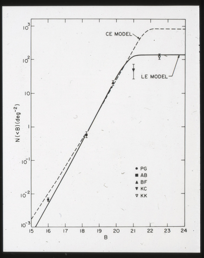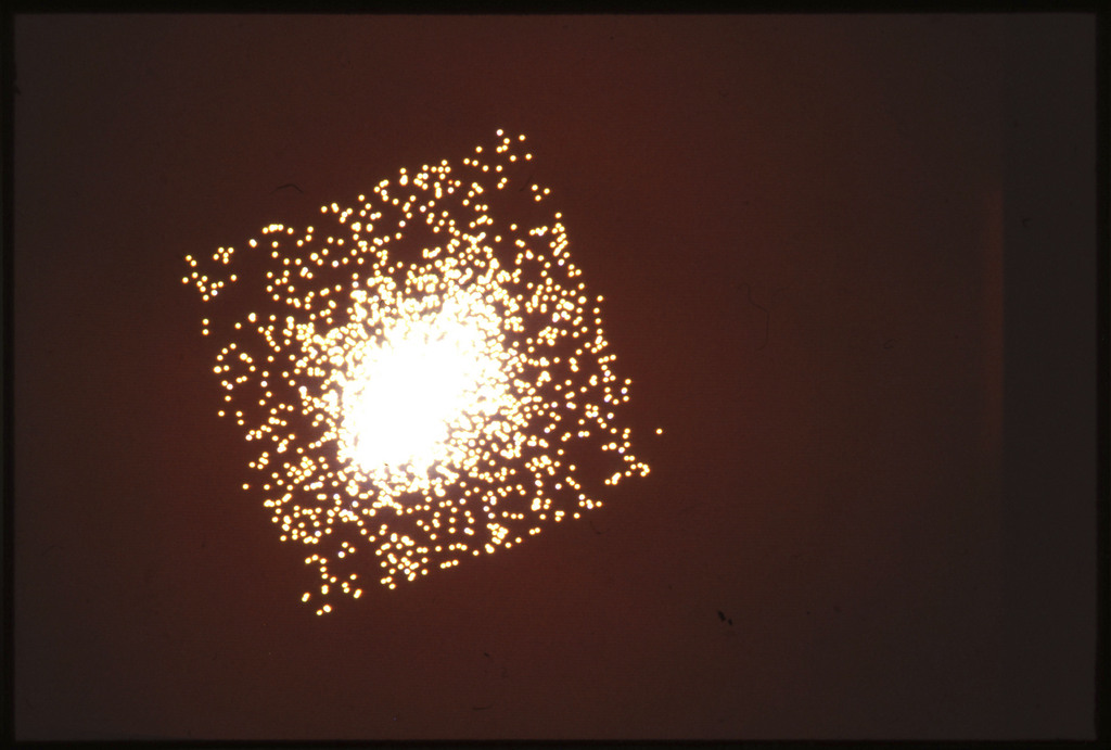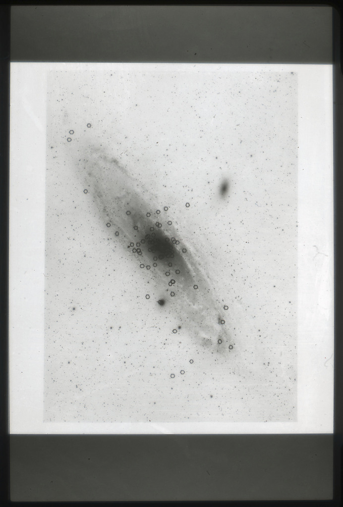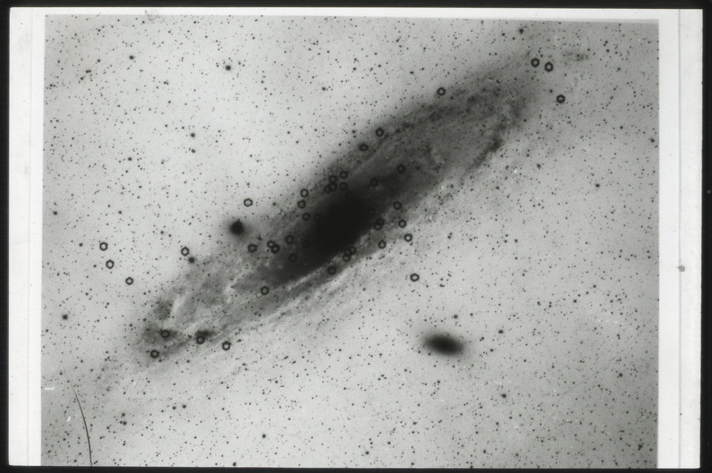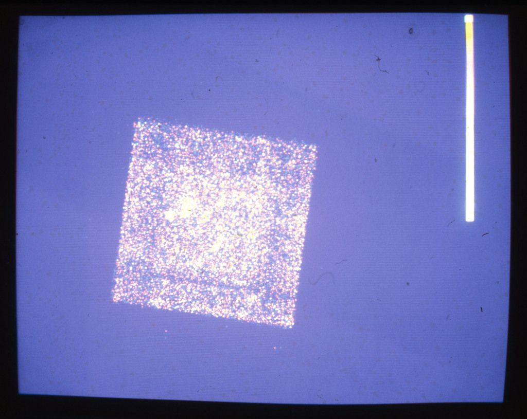 E/1003 A 1367. Optical picture of the cluster contains several hundred individual galaxies, the brightest of which are seen as the extended or fuzzy dark spots. |