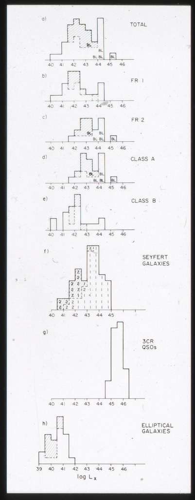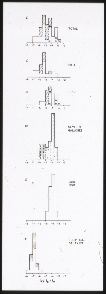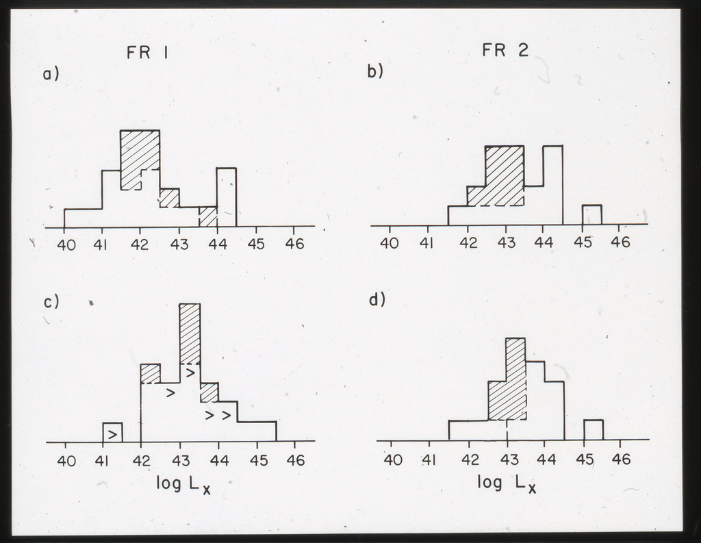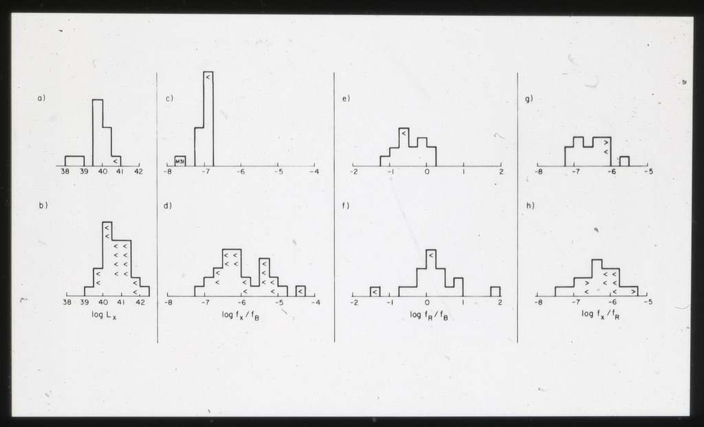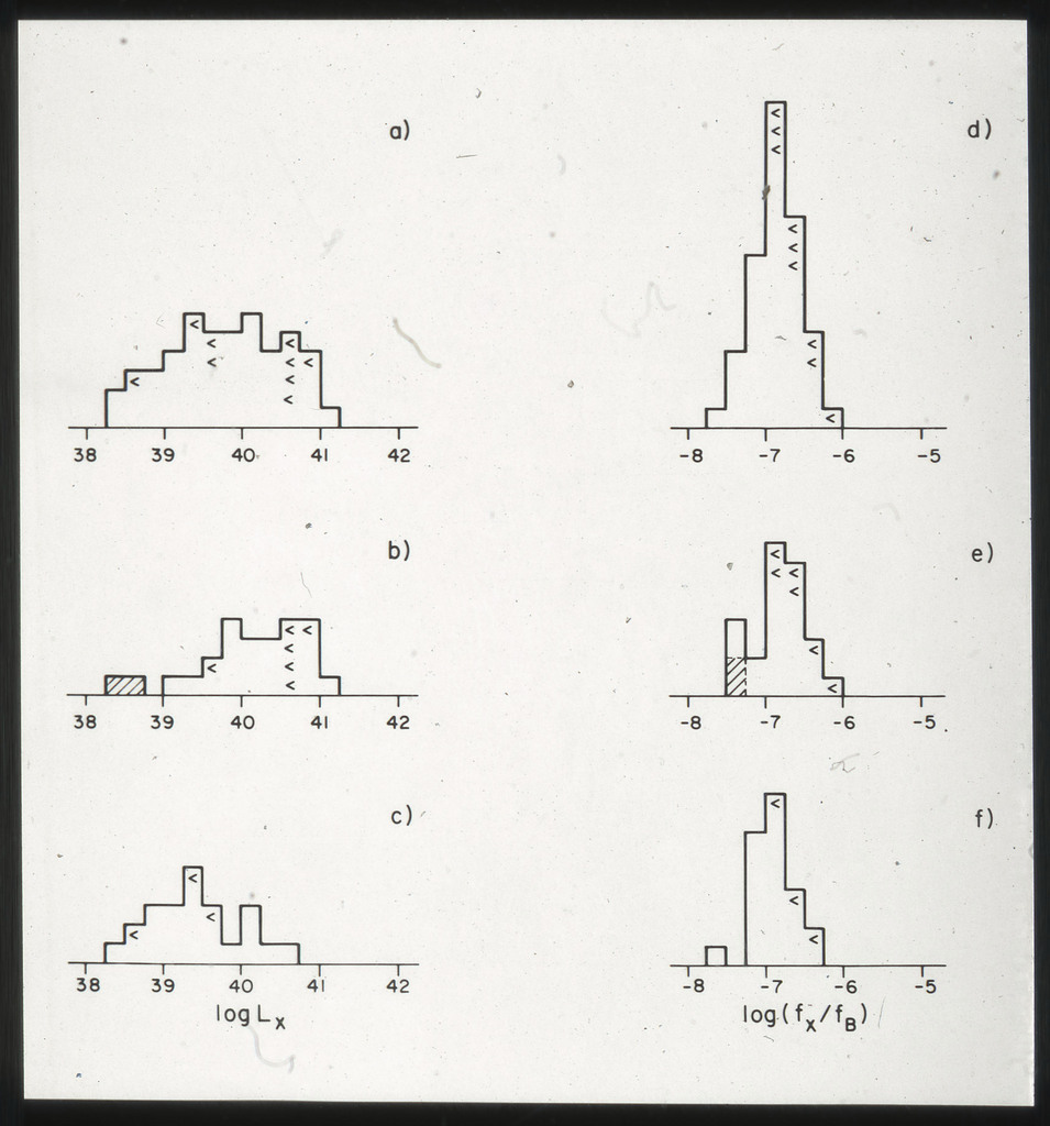 E/996 Distribution (a) of the X-ray luminosities L_x for the galaxies in the sample, and (b) Distribution of the X-ray to optical flux ratios of f_x/f_B. The hatched box represents NGC6876 for which only a Harvard Magnitude is listed in deVaucouleurs, de Vaucouleurs, and Corwin (1976). |