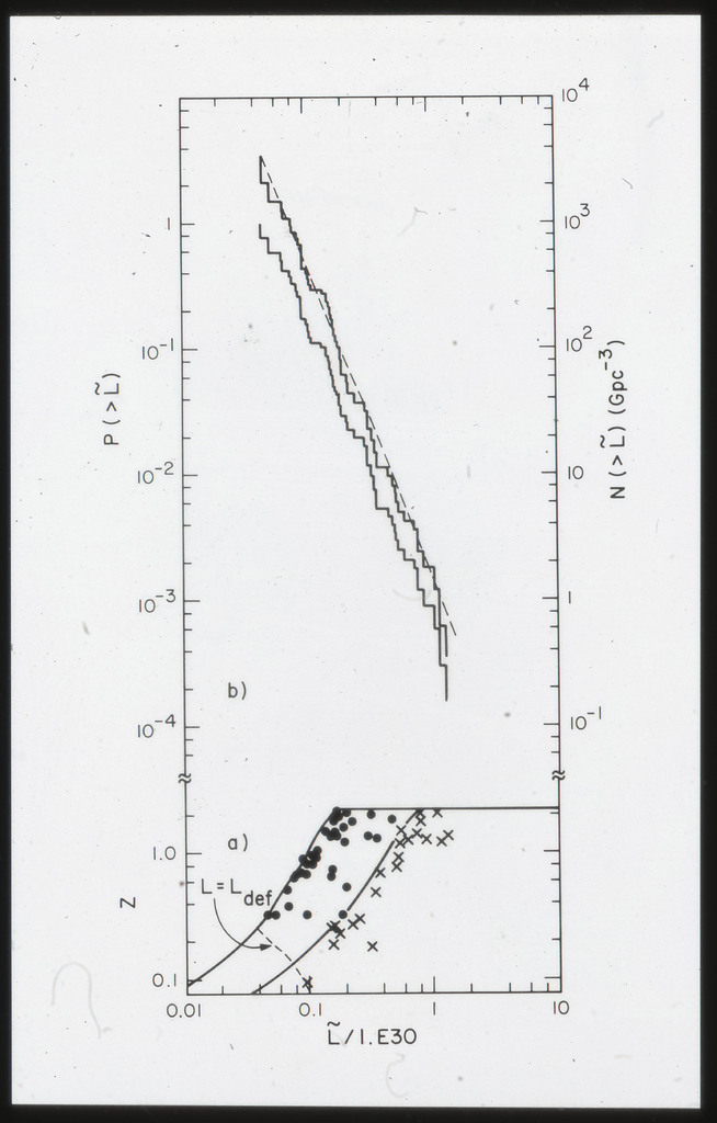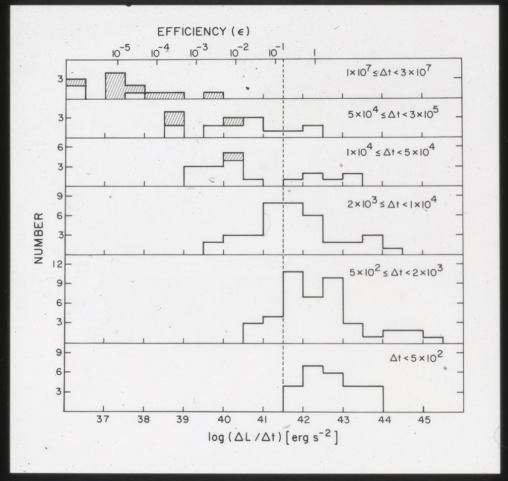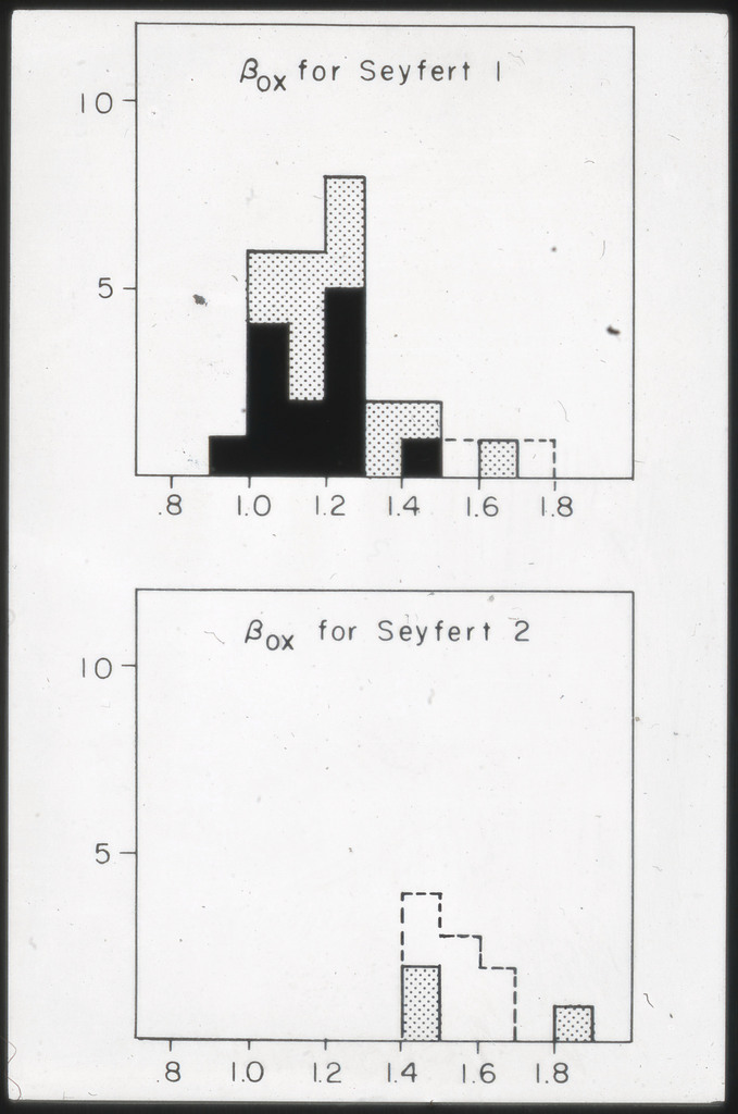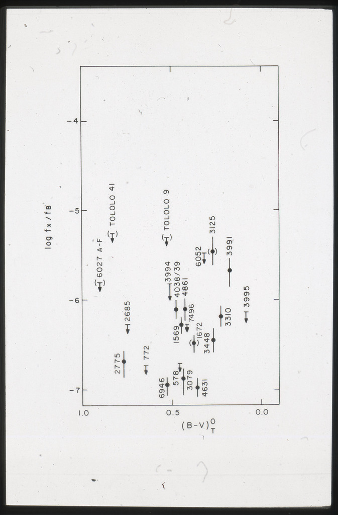 E/996 Distribution (a) of the X-ray luminosities L_x for the galaxies in the sample, and (b) Distribution of the X-ray to optical flux ratios of f_x/f_B. The hatched box represents NGC6876 for which only a Harvard Magnitude is listed in deVaucouleurs, de Vaucouleurs, and Corwin (1976). |