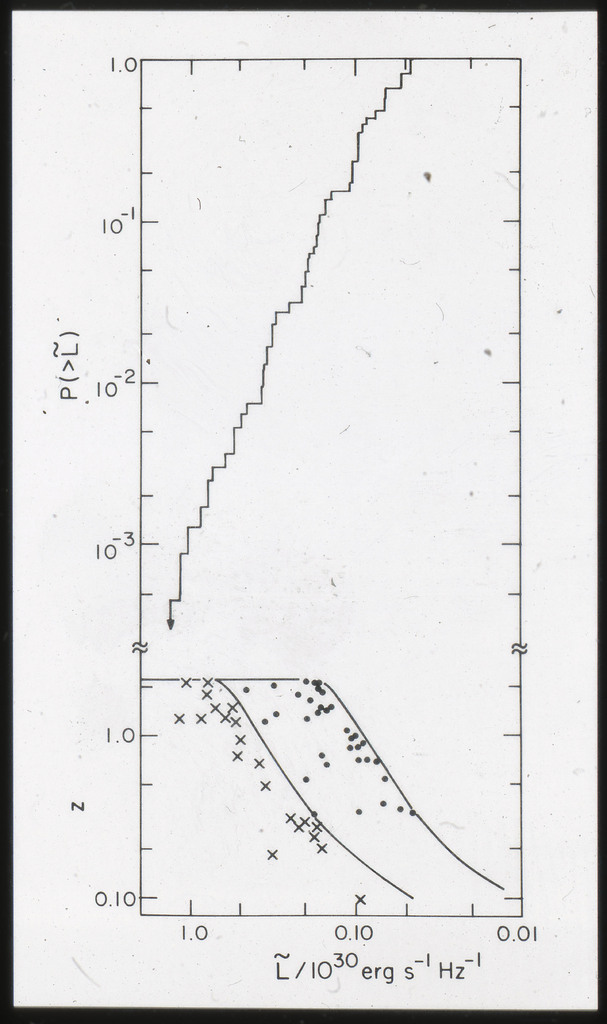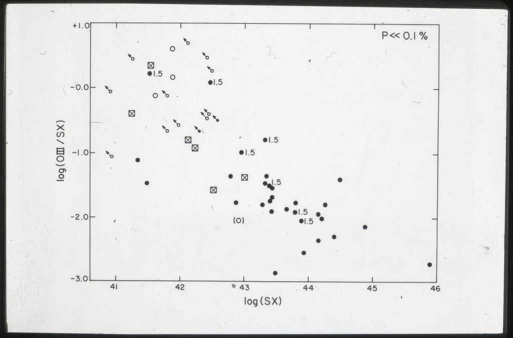E/1001 The monochromatic X-ray luminosity is plotted against the optical luminosity for normal elliptical and S0 galaxies (this sample, x) and the 3CR galaxies (Fabbiano et al. 1984). The V band magnitudes have been used for consistency with the data for 3CR galaxies. |