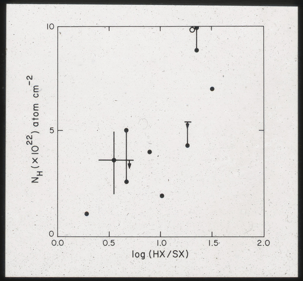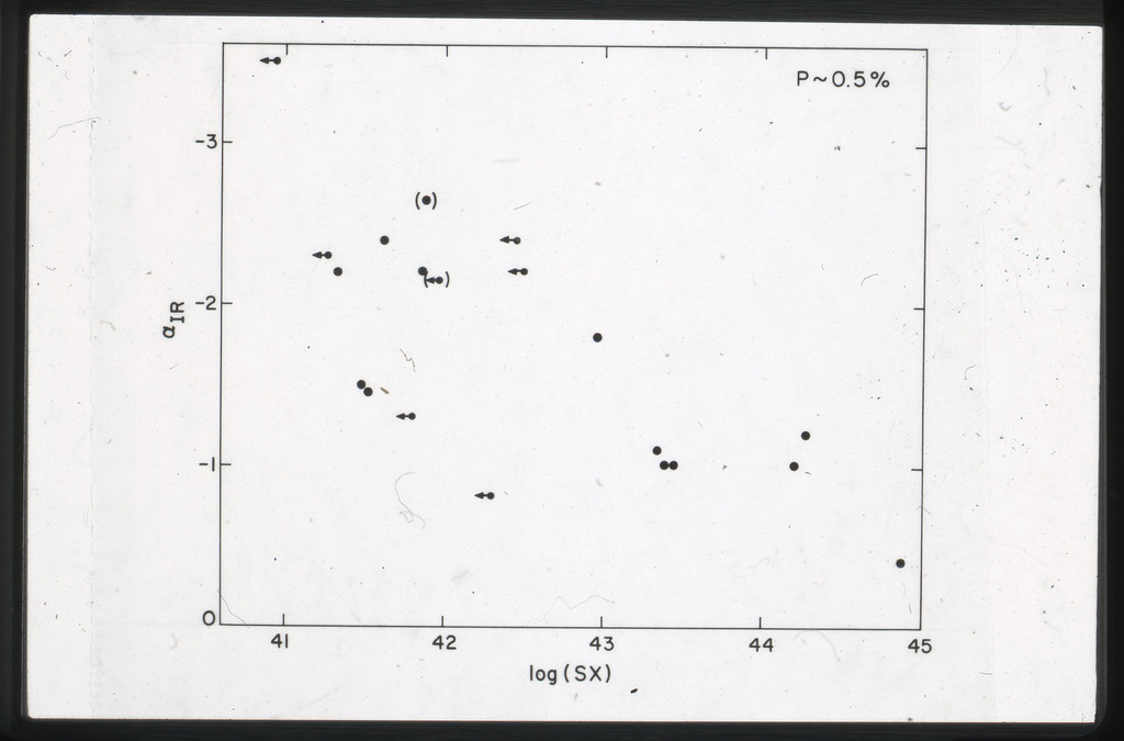 E/1008 Comparison between the x-ray, H alpha, blue light (disk and arms), far-infrared, neutral hydrogen, molecular hydrogen (derived from CO) and 21~cm radio continuum surface brightness profiles. The x-ray points are plotted on a composite of Figure~6 from Scoville and Young (1983). The x-ray data points have been corrected for the inclination of M51 (i = 20 deg) as in Scoville and Young (1983). X-ray points for R < 2~kpc are not plotted because off scale. All curves have been arbitrarily normalized. |