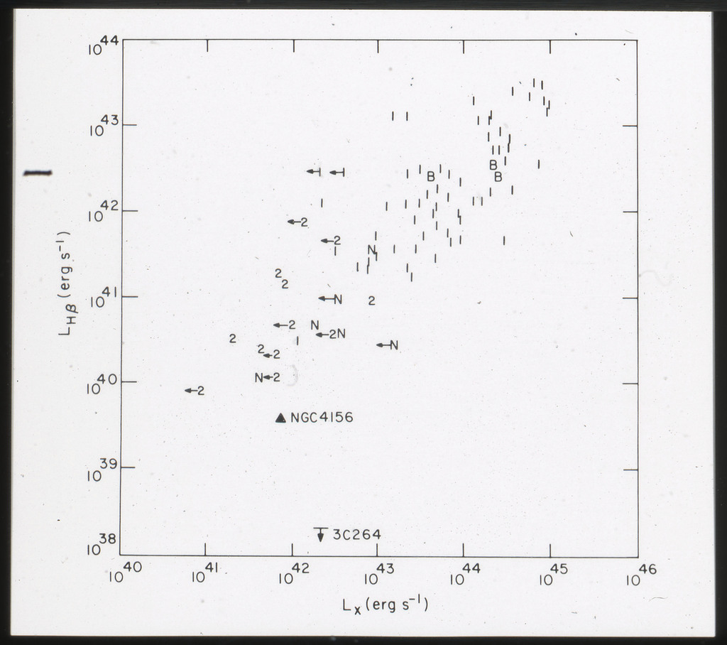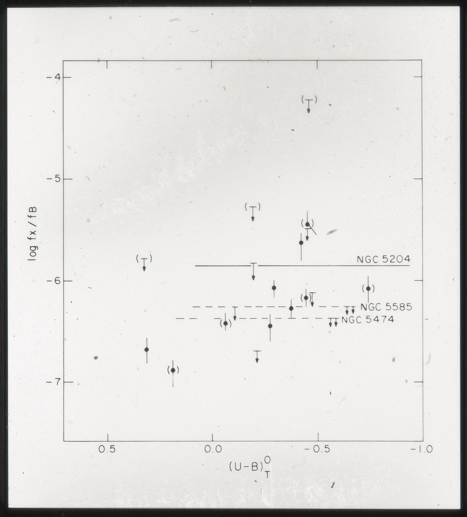E/997 (a) Plot of the X-ray monochromatic (2 keV) luminosity against the blue luminosity in units of erg/s.Hz. M84, M86 and the bulge of M31 are also shown. |