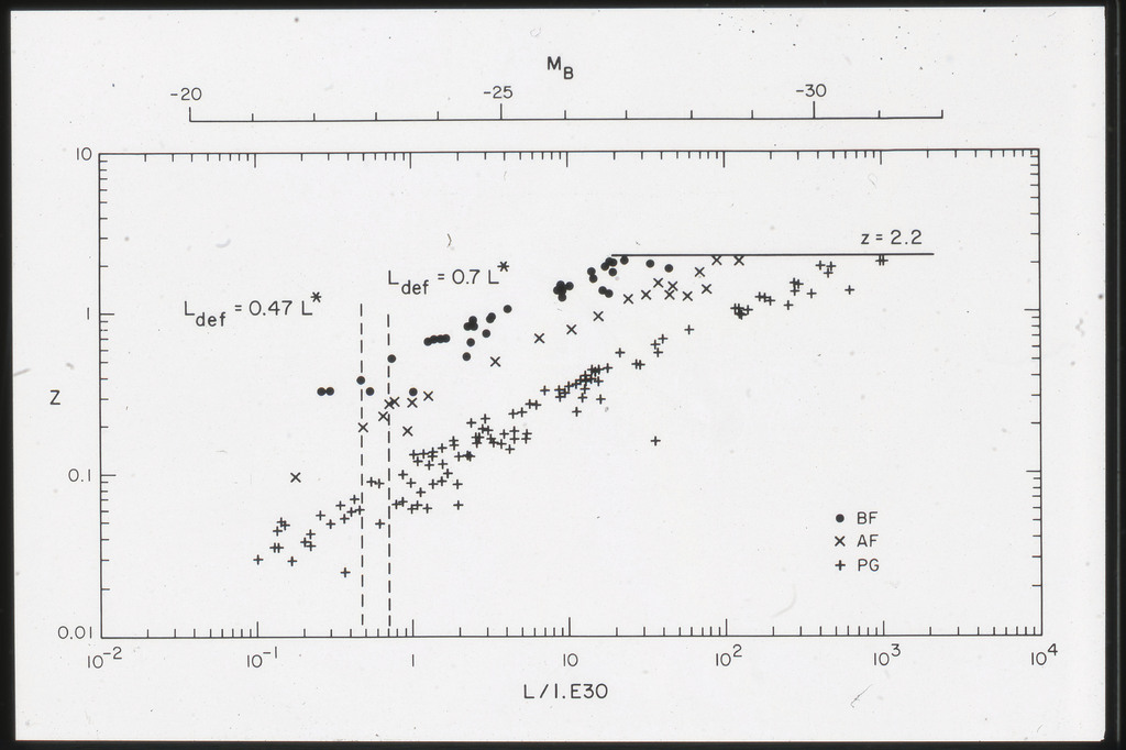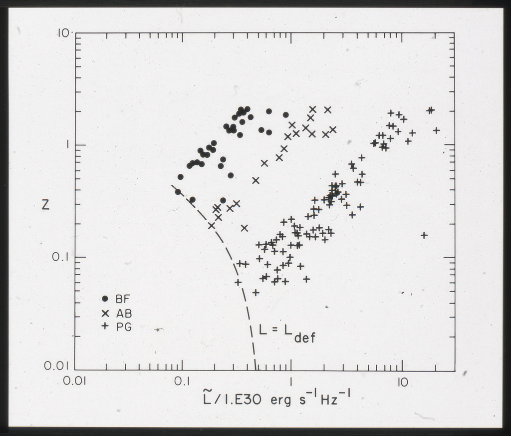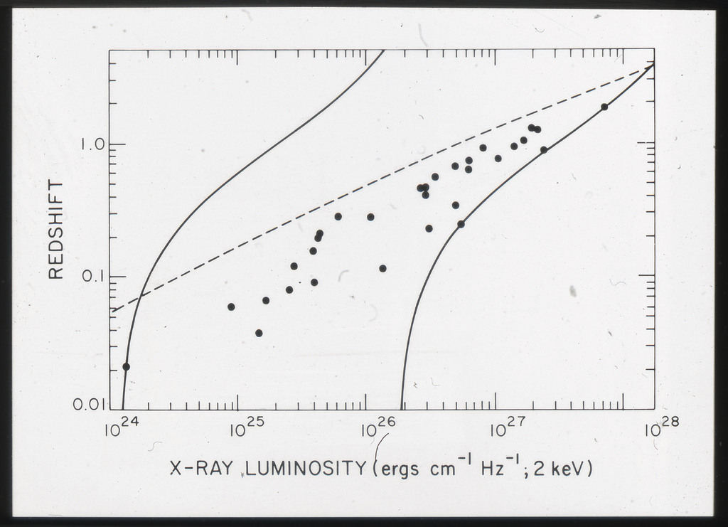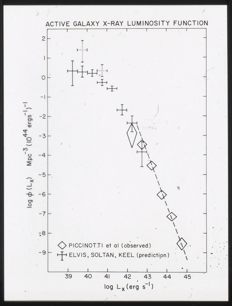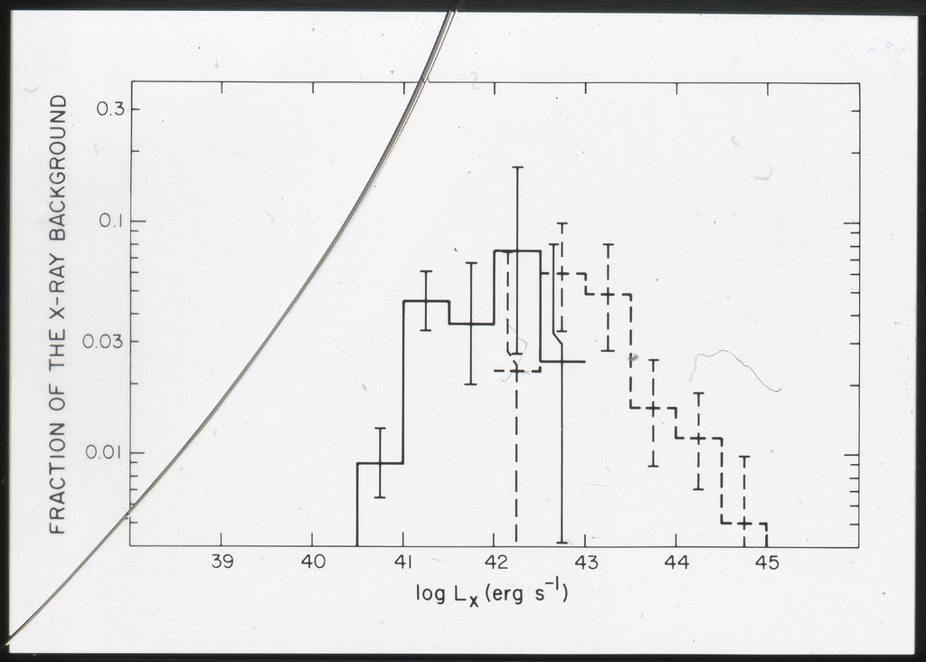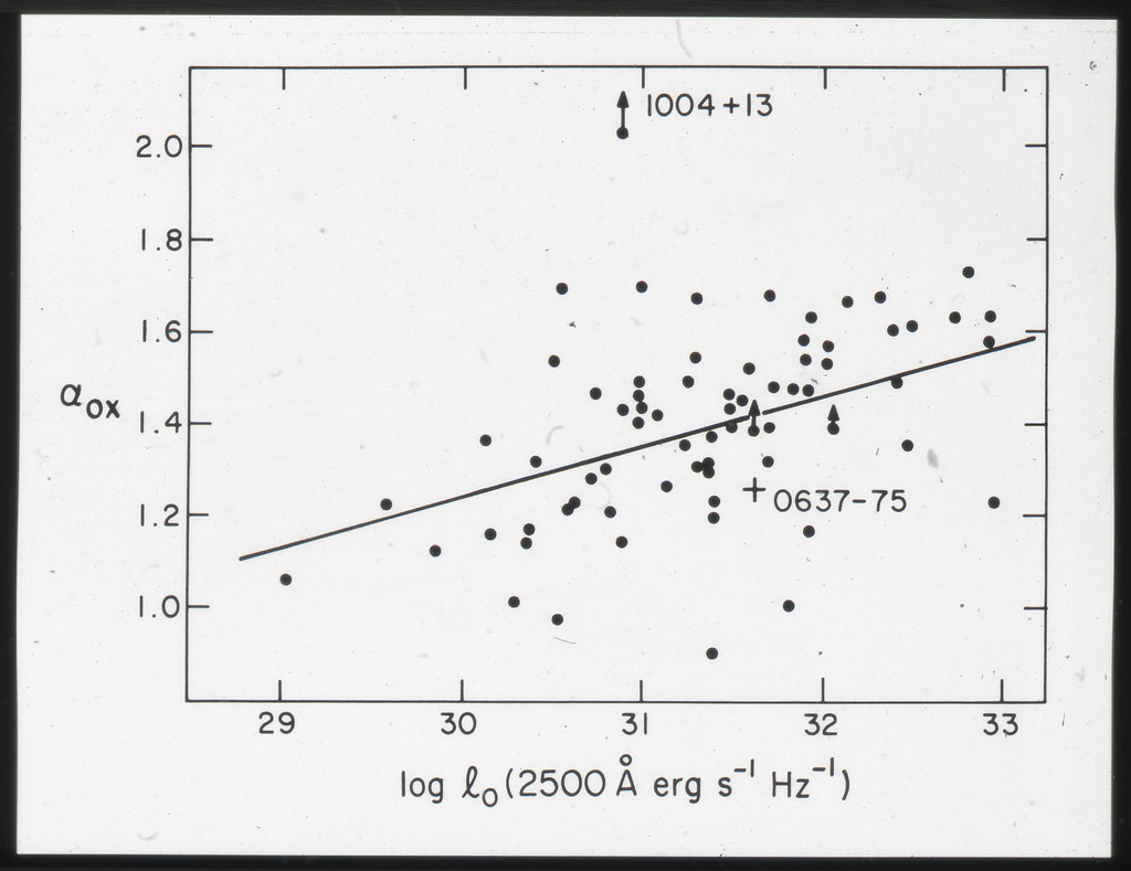 E/1002 The monochromatic X-ray luminosity of 3CR quasars and 3CR galaxies plotted as a function of optical luminosity. Dashed line represents the best fit to the 3CR quasar data. The solid lines represent how this best fit is modified when the effect of the whole galaxy is considered for three different optical luminosities. |