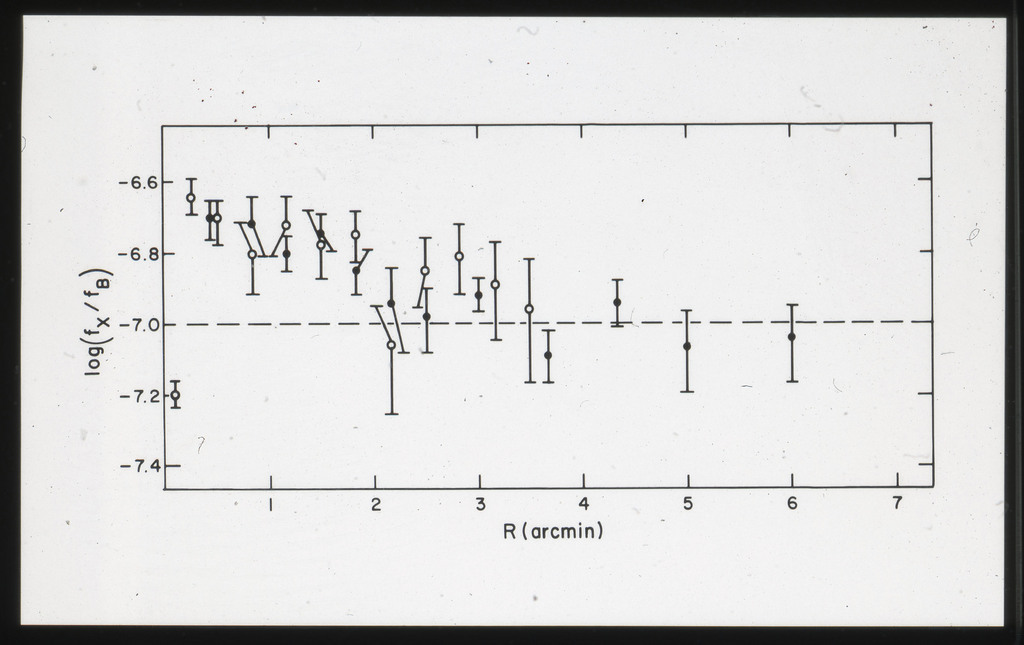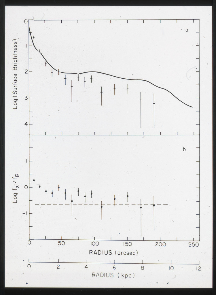 E/1007 a) X-ray (crosses) and optical blue (solid line) surface brightness profiles plotted as a function of radius. Azimuthal symmetry has been assumed. The relative normalization of the two curves is arbitrary; b) X-ray (f_x) over optical (f_B) flux ratio as a function of distance from the center of M51. The dashed line represents the average f_x/f_B for a radius > 100''. |