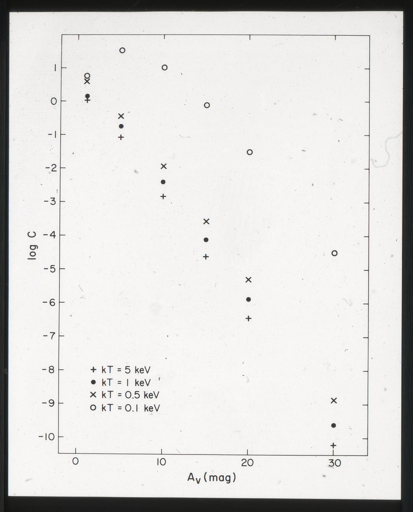 E/986 Correction factor C for the f_x/f_B ratio as a function of extinction A_v, calculated assuming a thermal bremsstrahlung spectrum for the X-ray emission. |