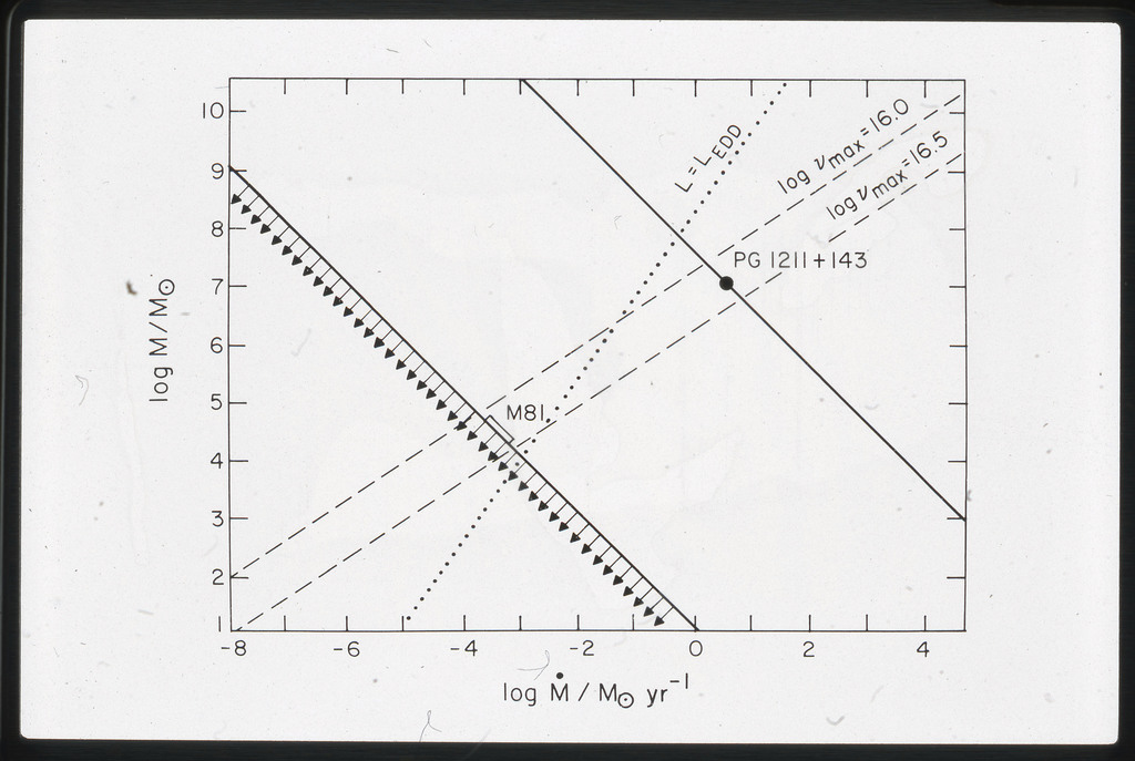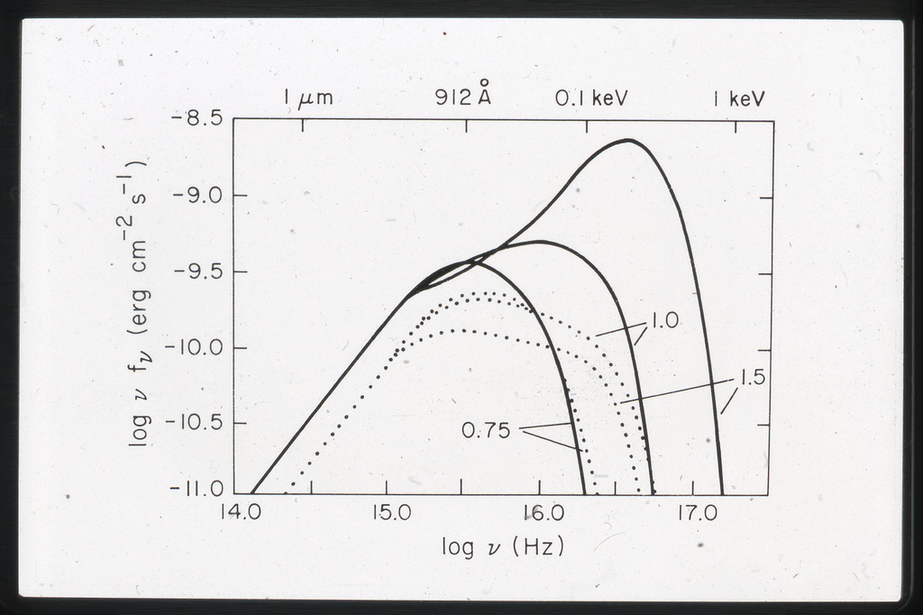 E/1062 Dependence of disk spectrum on accretion rate for assumed value of the flux in optical range (M.M=10^9). |
