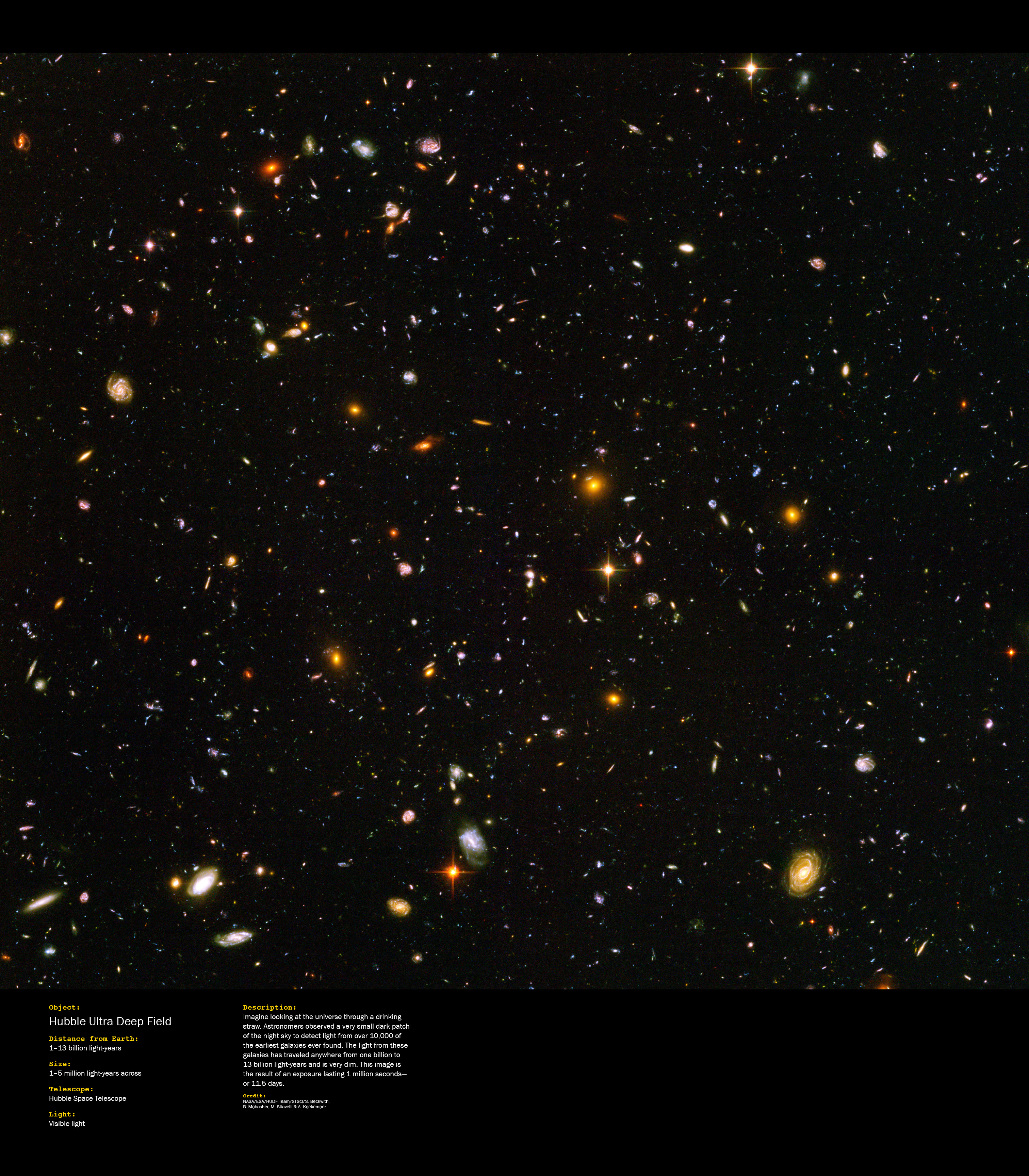 Imagine looking at the universe through a drinking straw. Astronomers observed a very small dark patch of the night sky to detect light from over 10,000 of the earliest galaxies every found. The light from these galaxies has travelled anywhere from one billion to 13 billion light years and is very dim. This image is the result of an exposure lasting 1 million seconds - or 11.6 days.