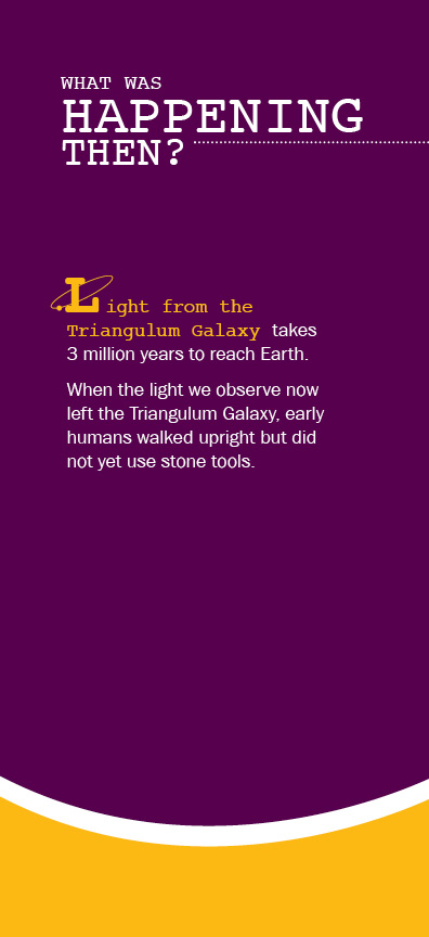 The center of the Triangulum galaxy is filled with older, yellow, long-burning stars. Younger, blue, fast-burning stars populate the spiral arms, creating waves of star formation that ripple around the central disk. Astronomers see the same processes and life cycles of stars in these nearby galaxies that they see in our own.