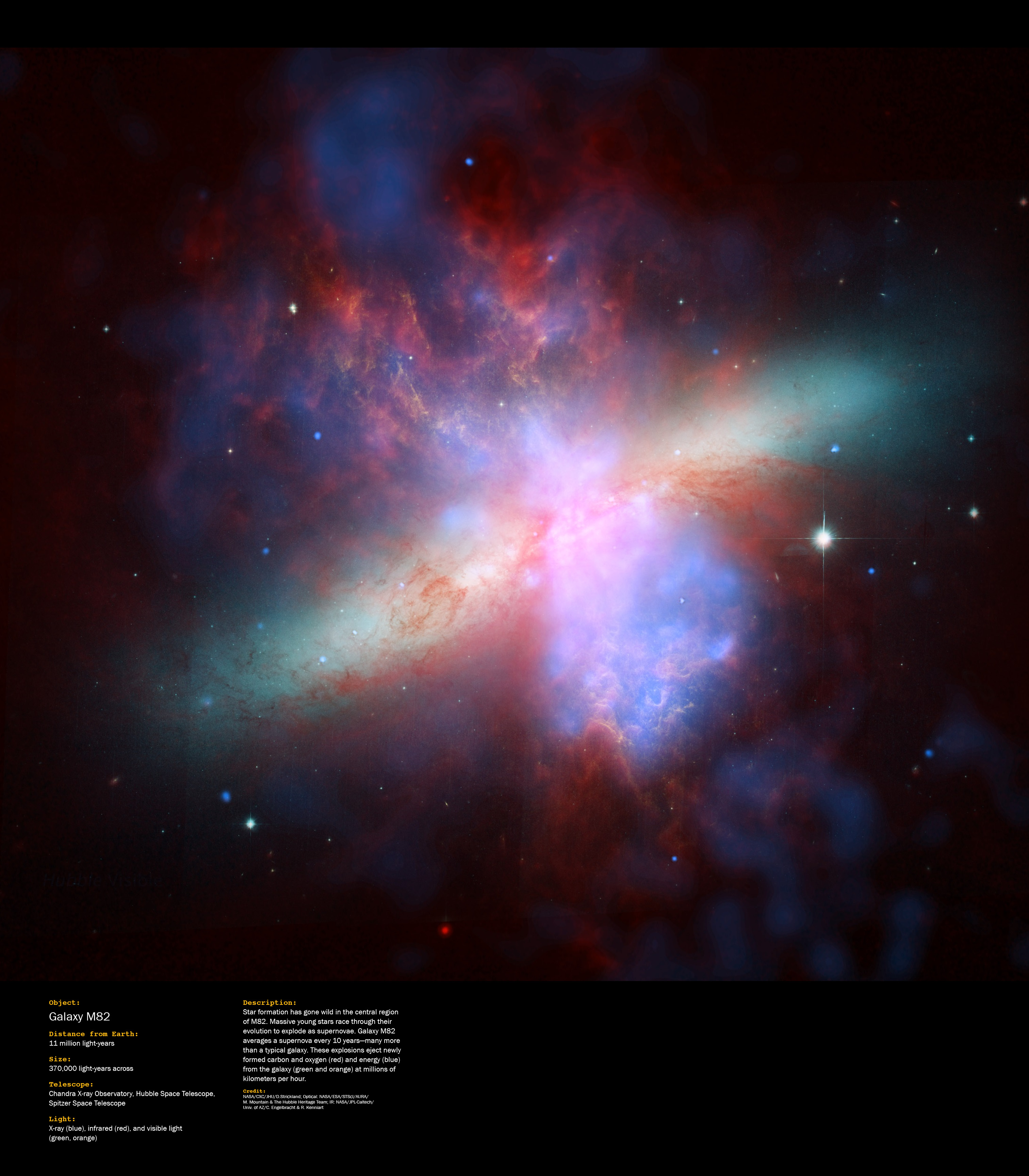 Star formation has gone wild in the central region of M82. Massive young stars race through their evolution to explode as supernovae. Galaxy M82 averages a supernova every 10 years - many more than a typical galaxy. These explosions eject newly formed carbon and oxygen in the form of cold (red) and hot (blue) gas from the galaxy (green and orange) at millions of kilometers per hour.