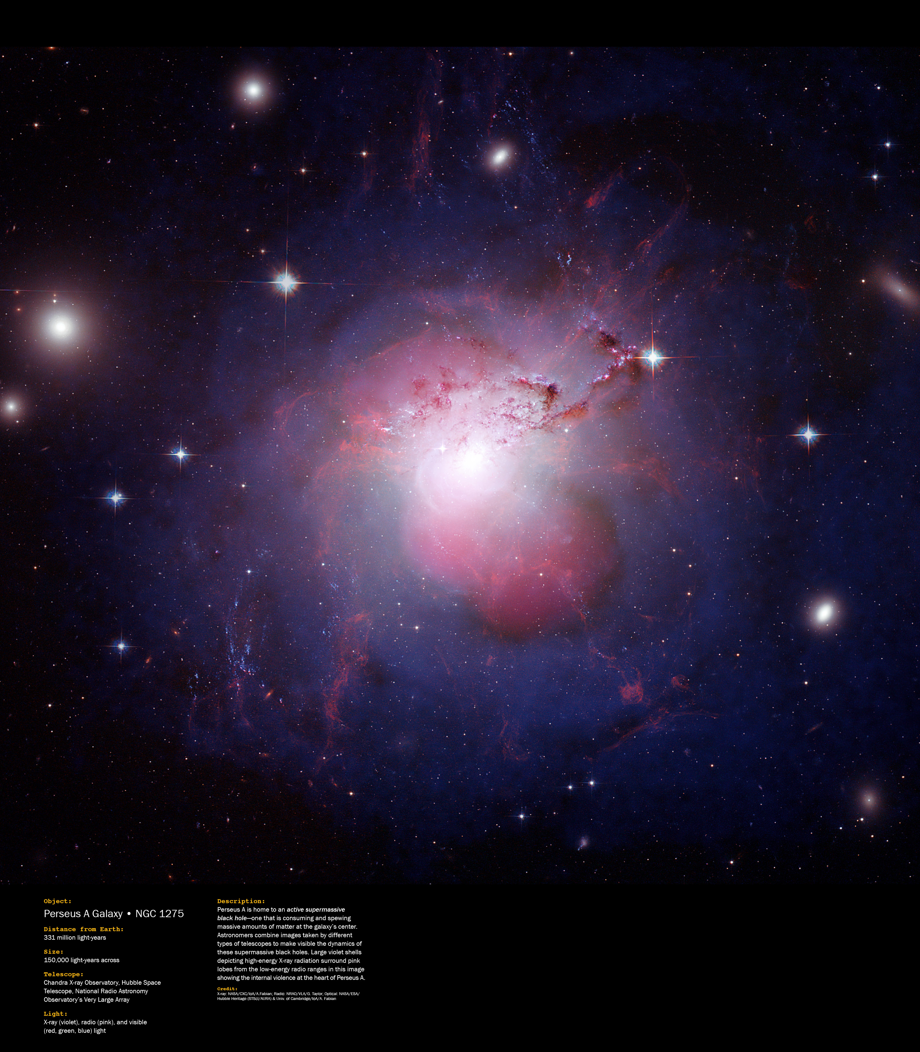Perseus A is home to an active supermassive black hole - one that is consuming and spewing massive amounts of matter at the galaxy's center. Astronomers combine images taken by different types of telescopes to make visible the dynamics of these supermassive black holes. Large violet shells depicting high energy X-ray radiation surround pink lobes from the low energy radio range in this image showing the internal violence at the heart of Perseus A.