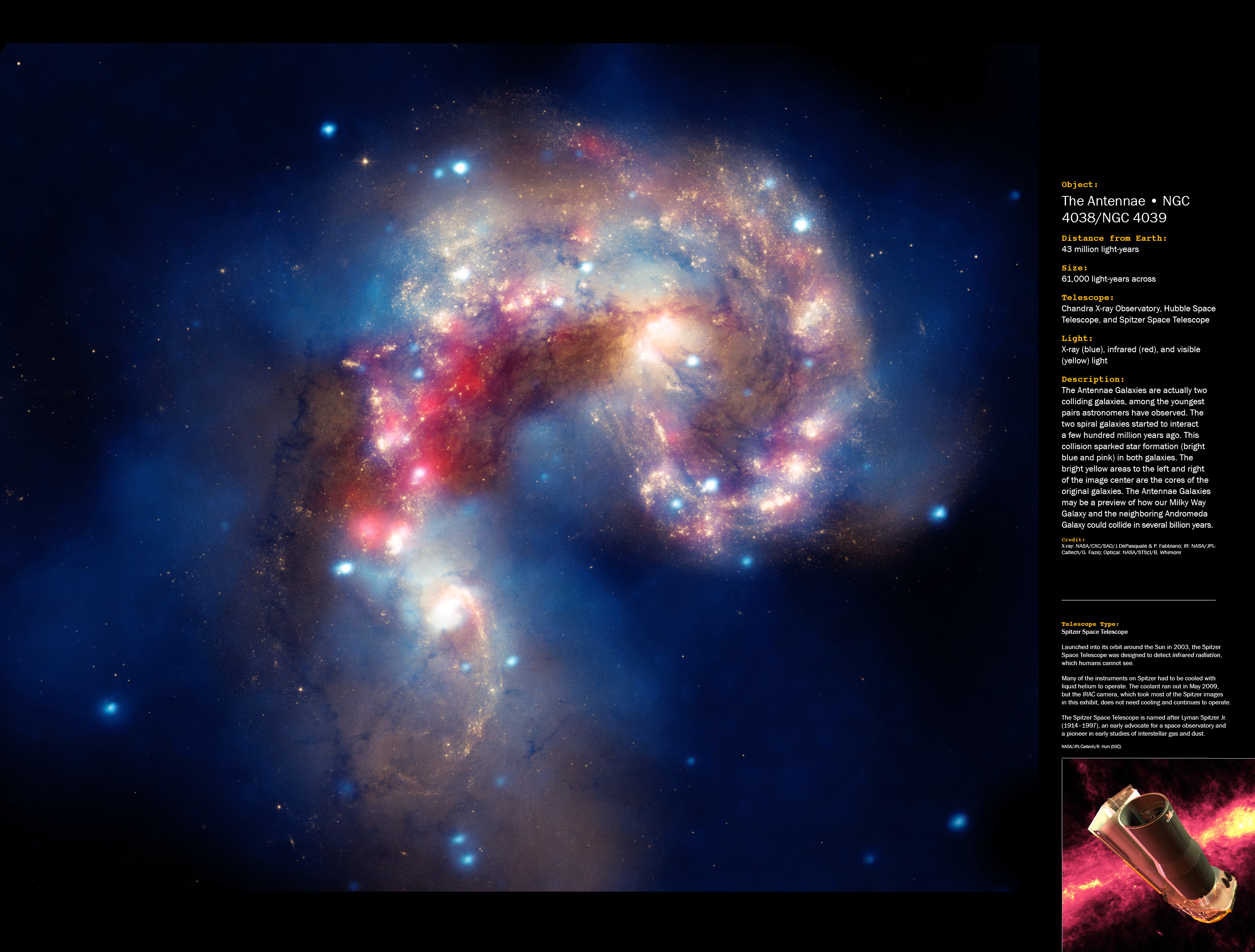 The Antennae Glaaxies are actually two colliding galaxies, among the youngest pairs astronomers have observed. The two spiral galaxies started to interact a few hundred million years ago. This collision sparked star formation (bright blue and pink) in both galaxies. The bright yellow areas to the left and right of the imnage center are the cores of the original galaxies. The Antennae system may be a preview of how our Milky Way Galaxy and the neighbouring Andromeda Galaxy could collide in several billion years.