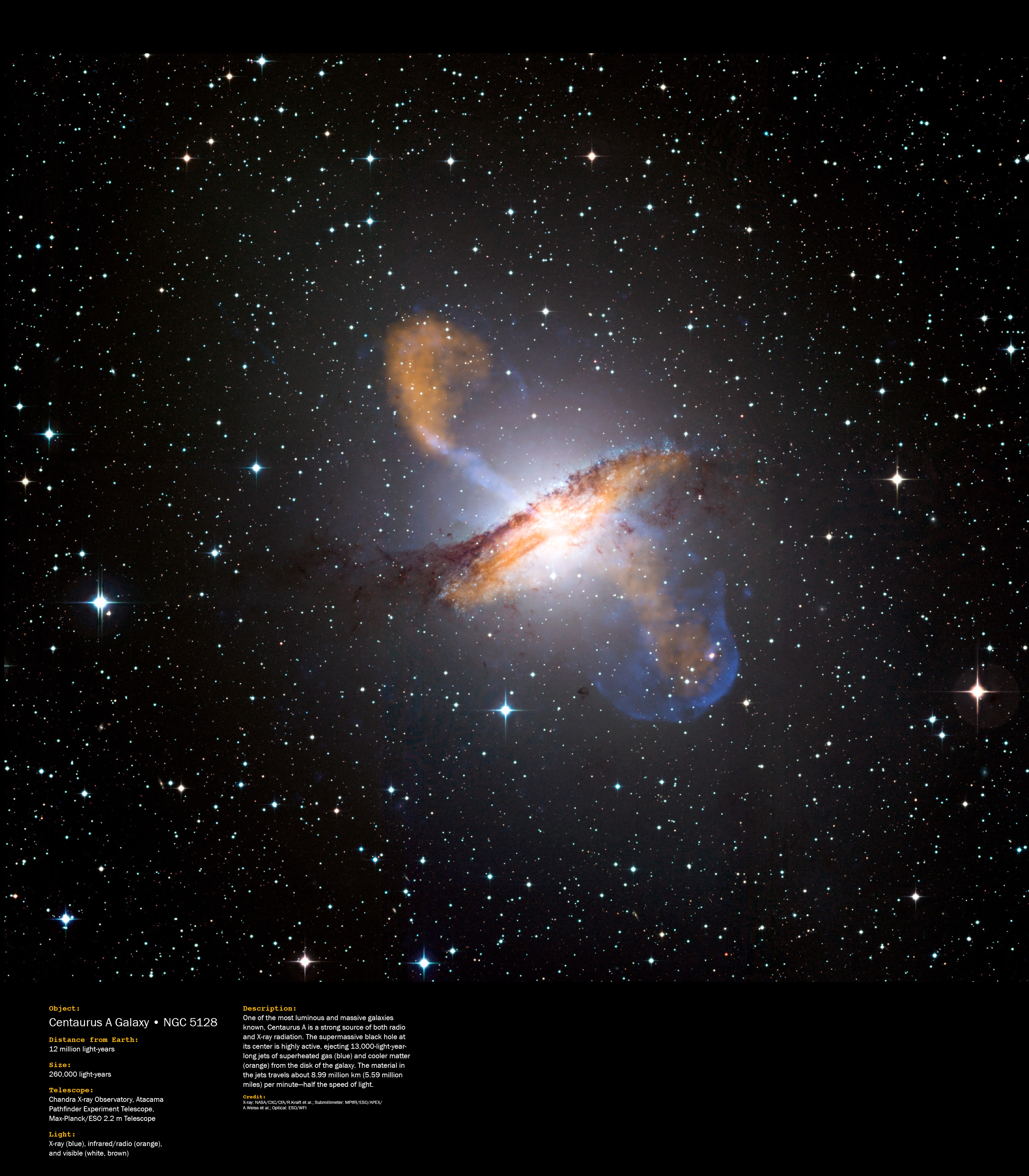 One of the most luminous and massive galaxies known, Centaurus A is a strong source of both radio and X-ray radiation. The supermassive black hole at its center is highly active, ejecting 13,000-light-year-long jets of superheated gas (blue) and cooler matter (orange) from the disk of the galaxy. The material in the jets travels about 9 million km per minute - half the speed of light.