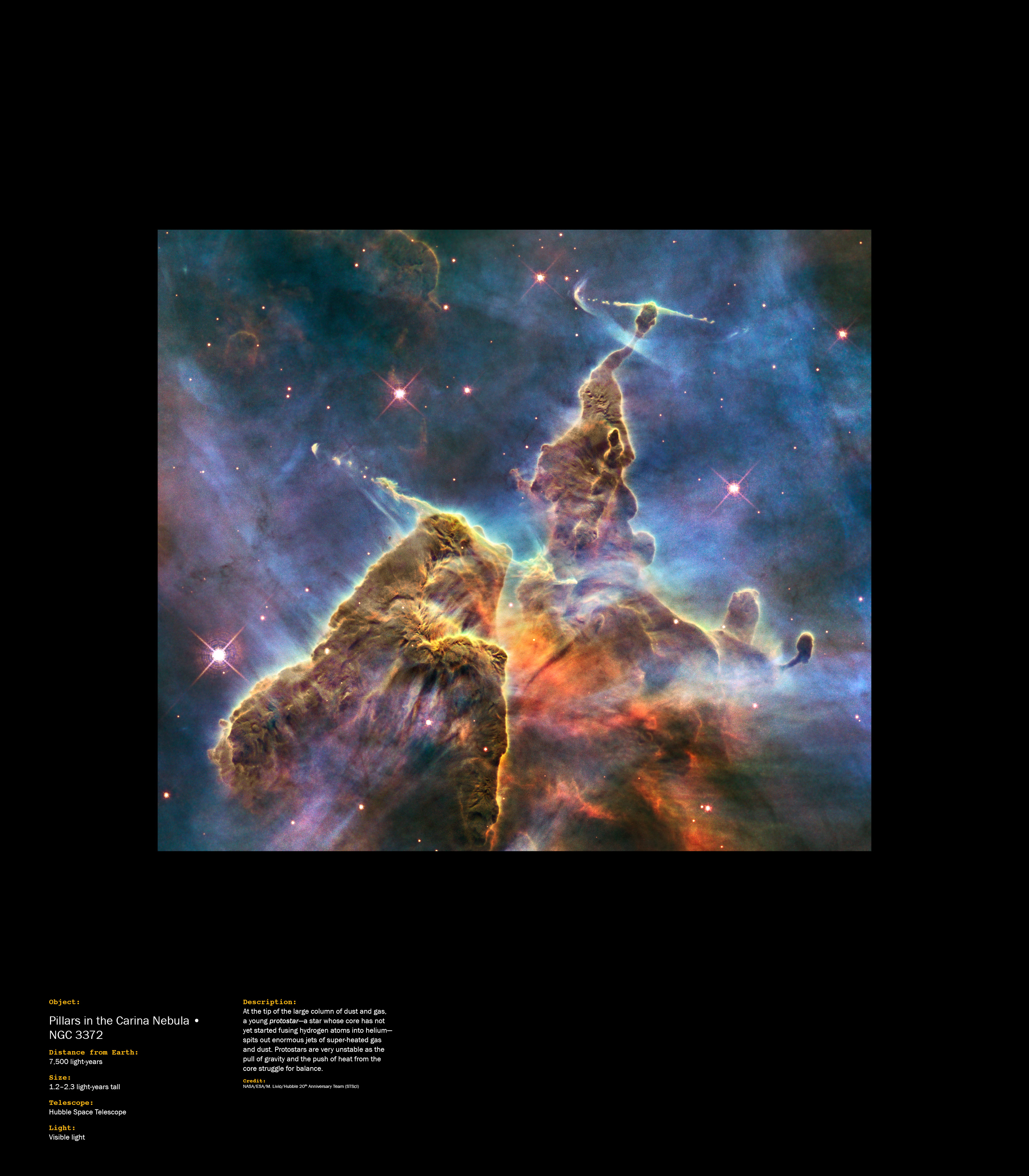 At the tip of the large column of dust and gas, a young protostar - a star whose core is not yet stably fusing hydrogen atoms into helium - spits out enormous jets of superheated gas and dust. Protostars are very unstable as the pull of gravity and the push of heat from the core struggle for balance. The columns you see here have been carved out of the Carina nebula by the winds from young stars, in much the same way that Earthly winds sculpt rocks in the deserts of the American SouthWest.