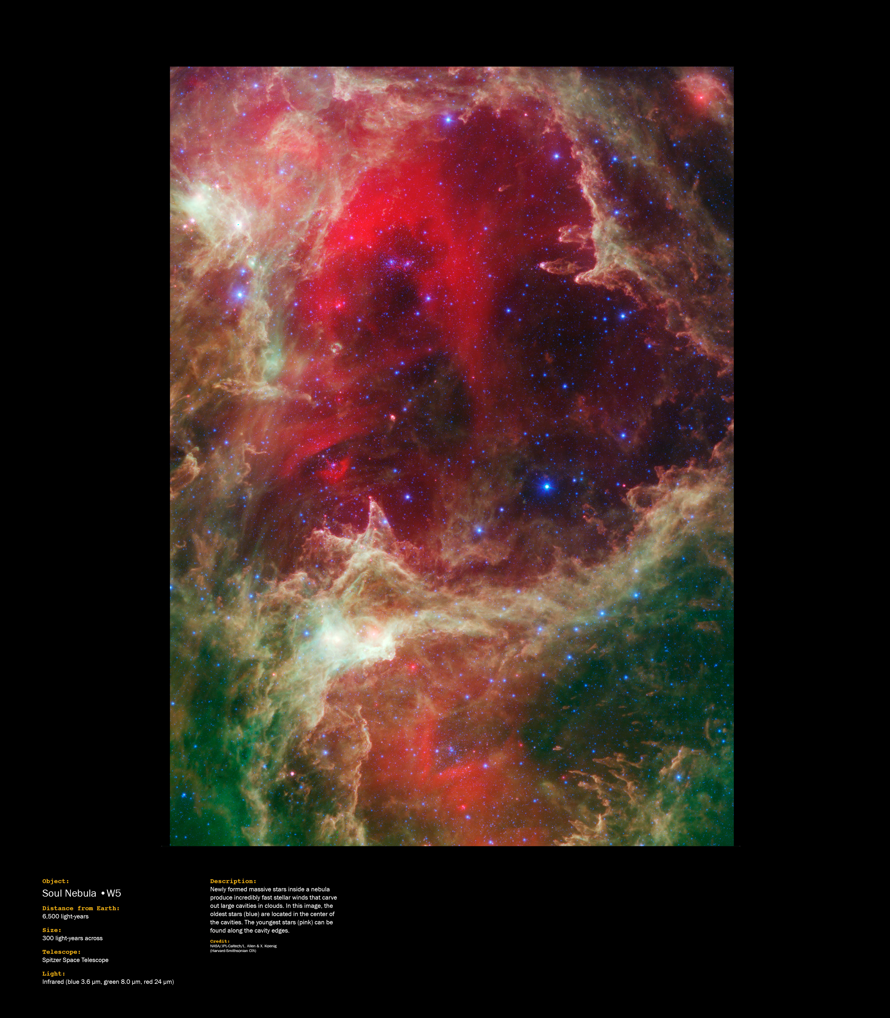 Newly formed massive stars inside a nebule produce incredibly fast stellar winds that carve out large cavities in cludes. In this image, the oldest stars (blue) are located in the center of the cavities. The youngest stars (pink) can be found along the cavity edges.
