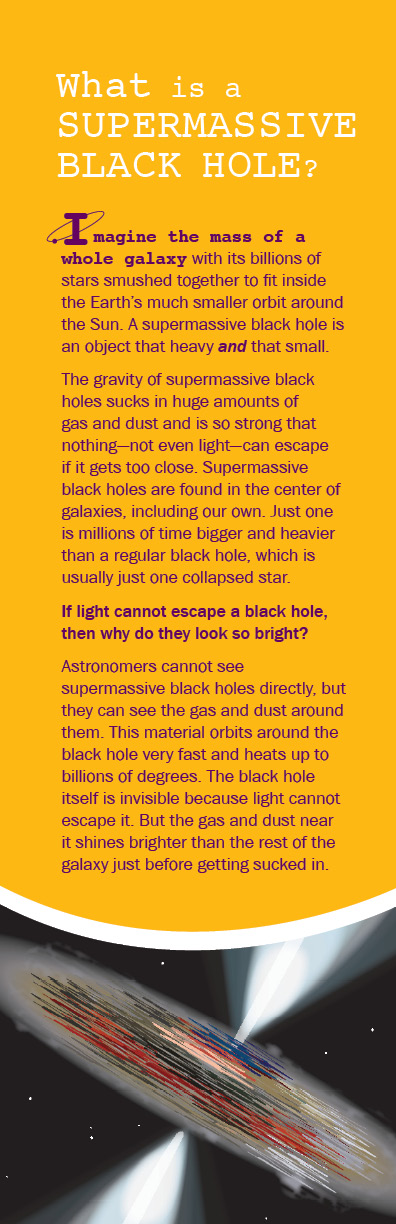 The gravity of supermassive black holes sucks in huge amounts of gas and dust and is so strong that nothing—not even light—can escape if it gets too close. Supermassive black holes are found in the center of galaxies, including our own. Just one is millions of time bigger and heavier than a regular black hole, which is usually just one collapsed star.