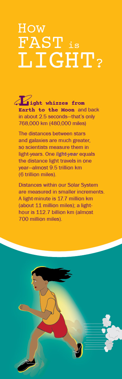 Light whizzes from Earth to the Moon and back in about 2.5 seconds - that's only 768,000 km (480,000 miles).