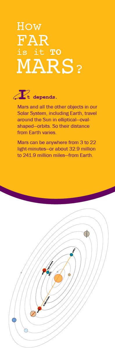 Mars and all the other objects in our solar system, including Earth, travel around the Sun in ellipical (oval-shaped) orbits. So their distance from Earth varies.