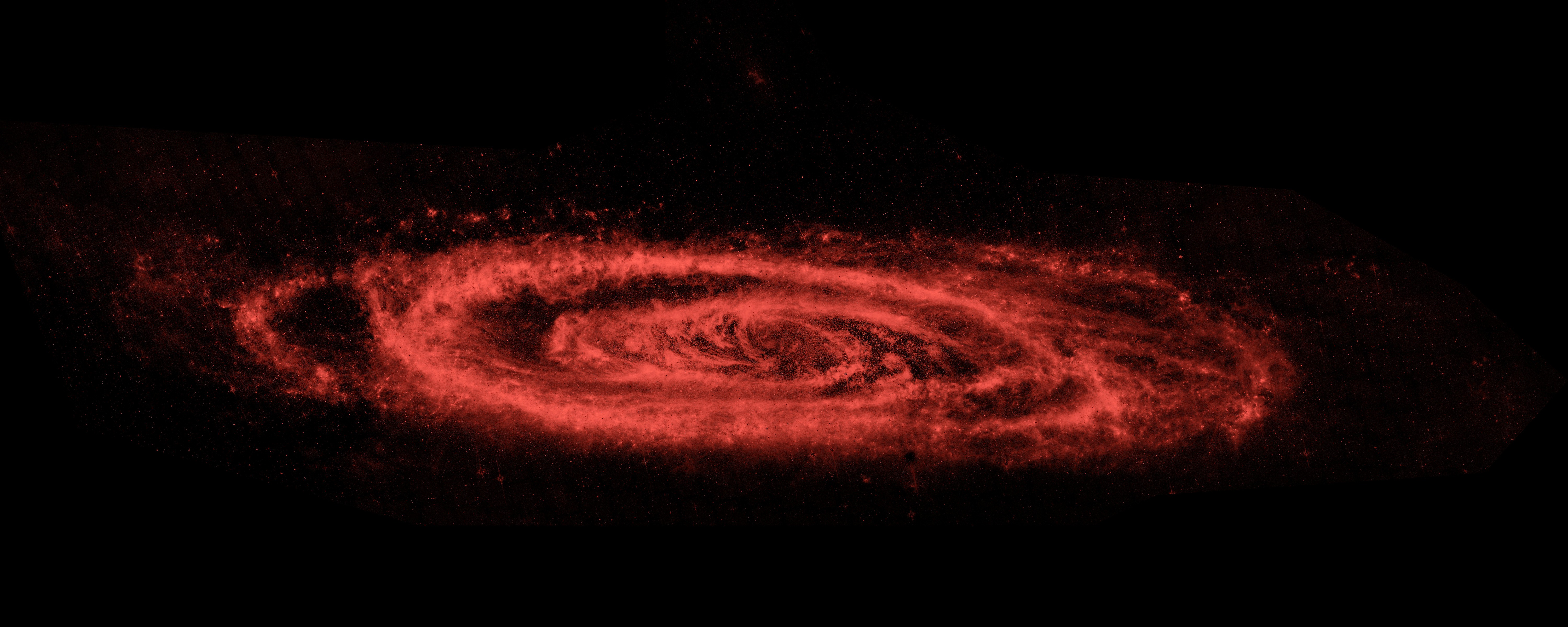 The multi-colored image of the Andromeda Galaxy combines two images taken of different ranges of radiation—energy emitted as waves or particles—that we normally cannot see.