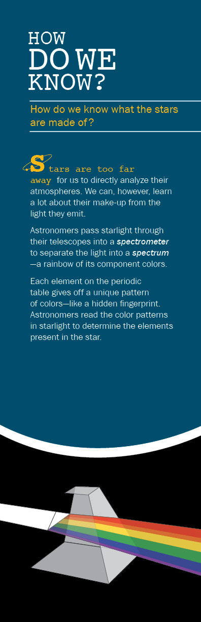 Each element on the periodic table gives off a unique pattern of colors - like a hidden fingerprint. Astronomers read the color patterns in starlight to determine the elements present in the star.