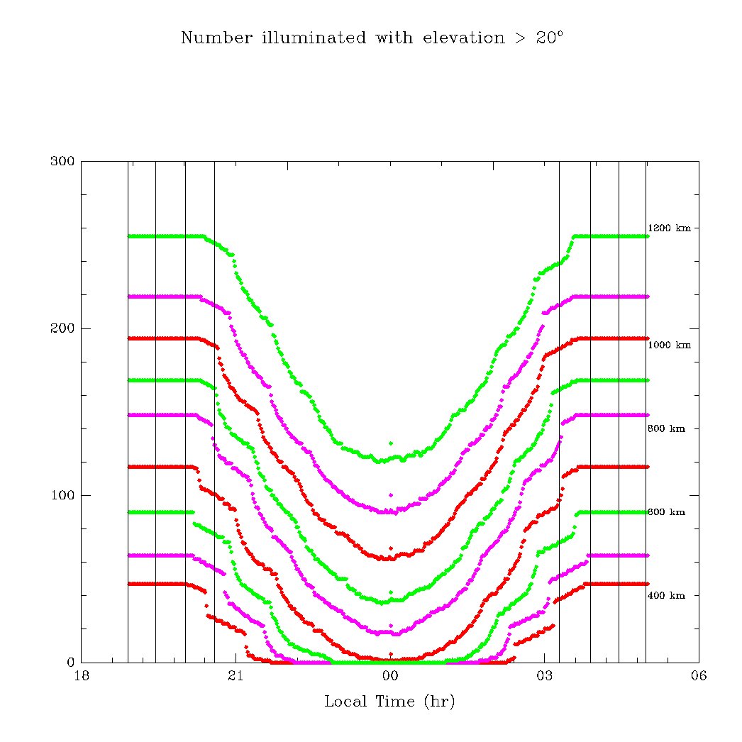 The plot shows the number of illuminated satellites above 20 degees elevation versus time of night.