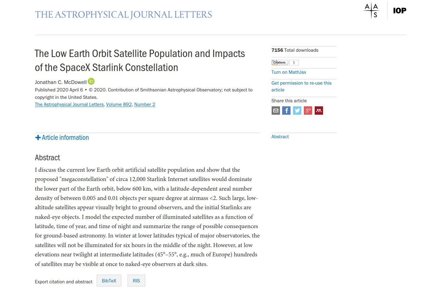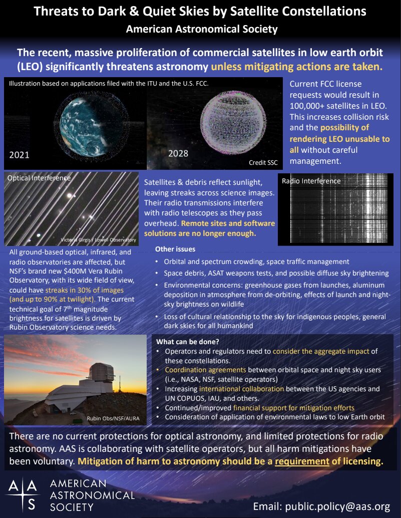 In 2019 SpaceX began deploying a constellation of internet relay satellites called Starlink. The satellites are relatively large (about 3m flat-panel bus with 8m solar array) and in low (300-550 km) orbits, and in their initial design are unexpectedly bright naked-eye objects. Various proposals filed with the FCC described constellations of 4000, 12000 and ultimately 30,000 satellites. Widespread optical observations of the satellites raised the concern that the fully deployed constellation would have severe impacts on astronomical observations and even on appreciation of the night sky by ordinary people around the world.