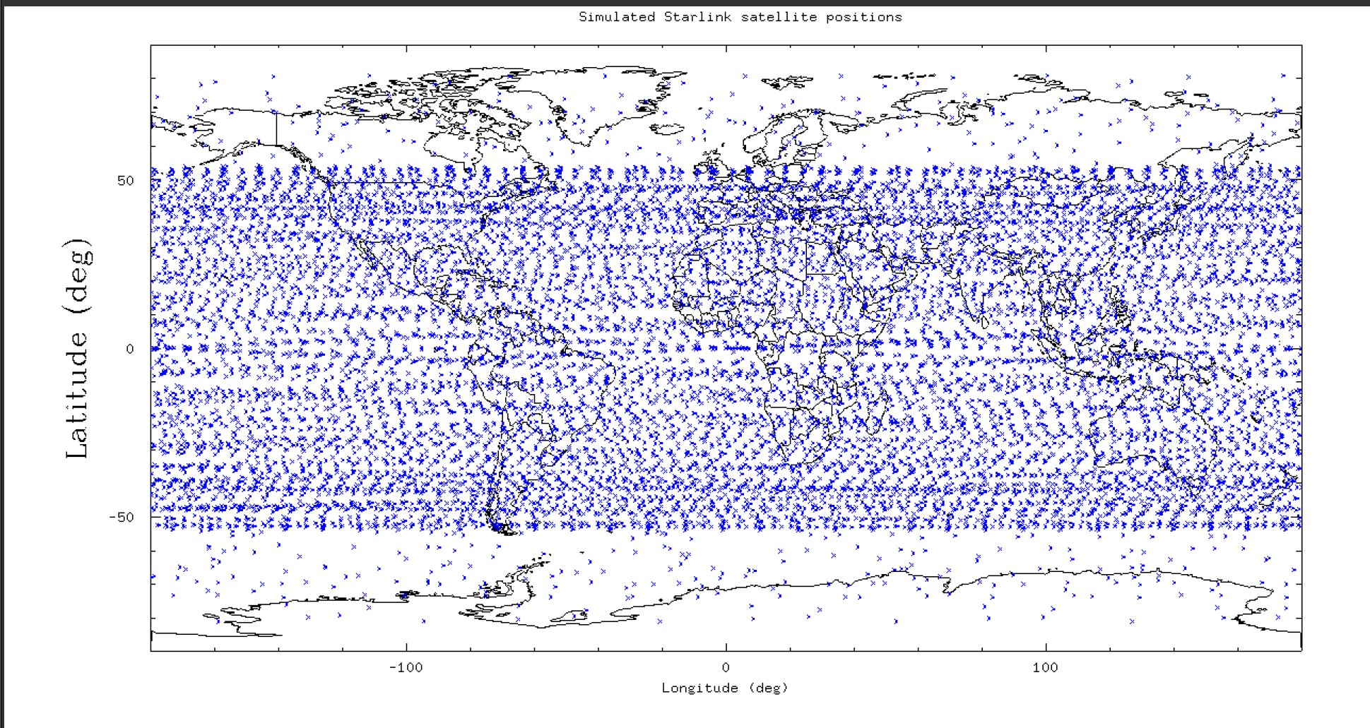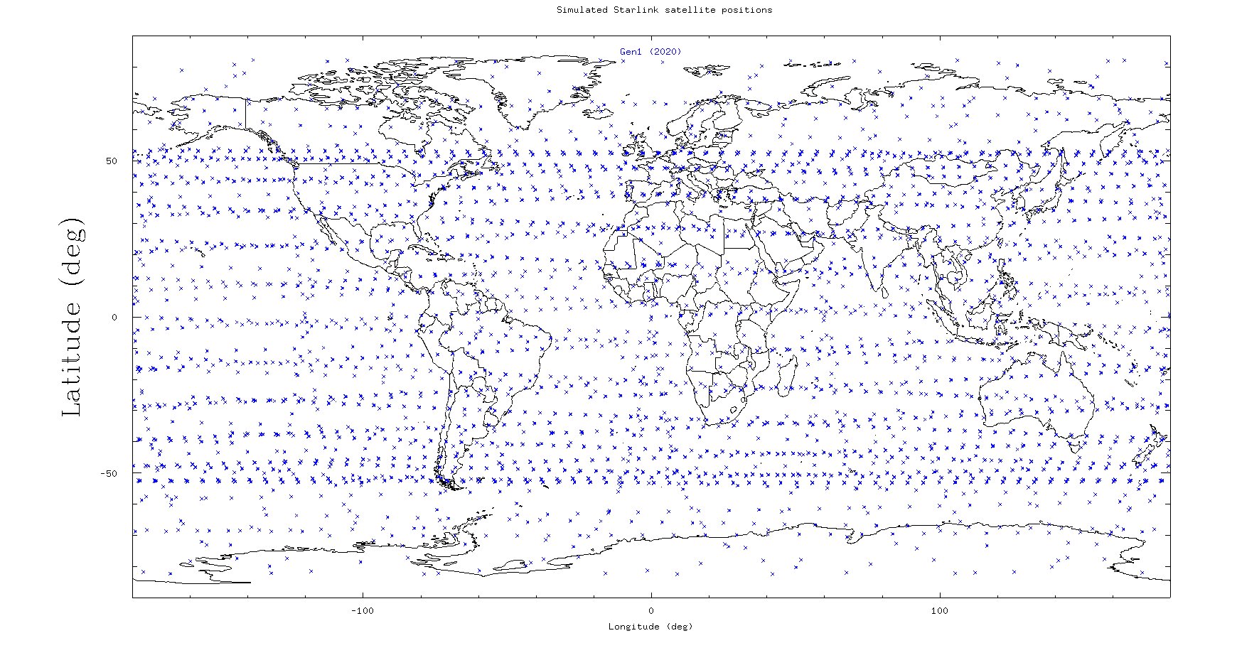 Realization of Starlink mod Gen1 (Model II) constellation, showing the varying density of satellites with latitude.