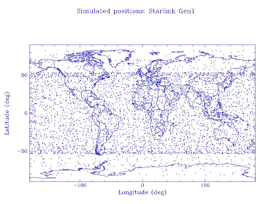 Realization of Starlink OLD (Model I) constellation, showing the varying density of satellites with latitude.