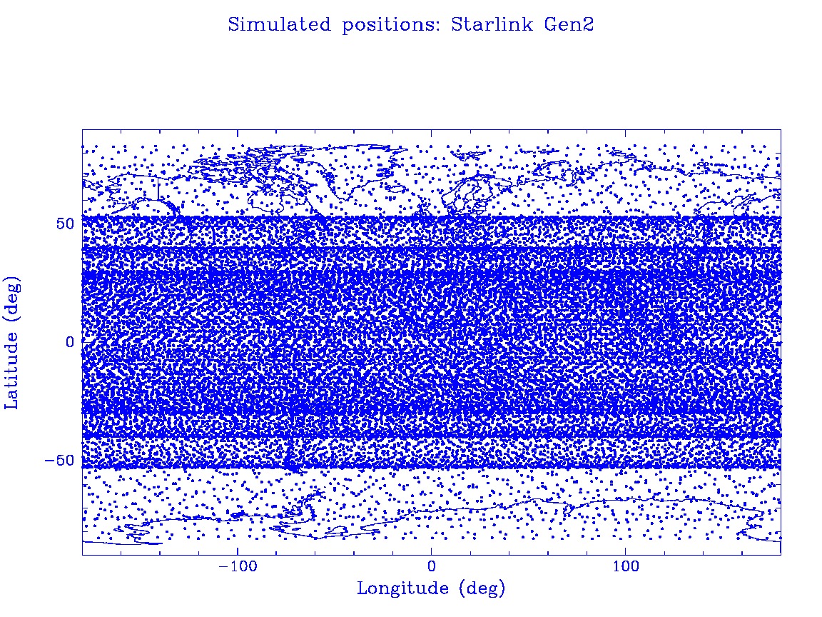 Realization of Starlink Gen2 (Model III) constellation, showing the varying density of satellites with latitude.