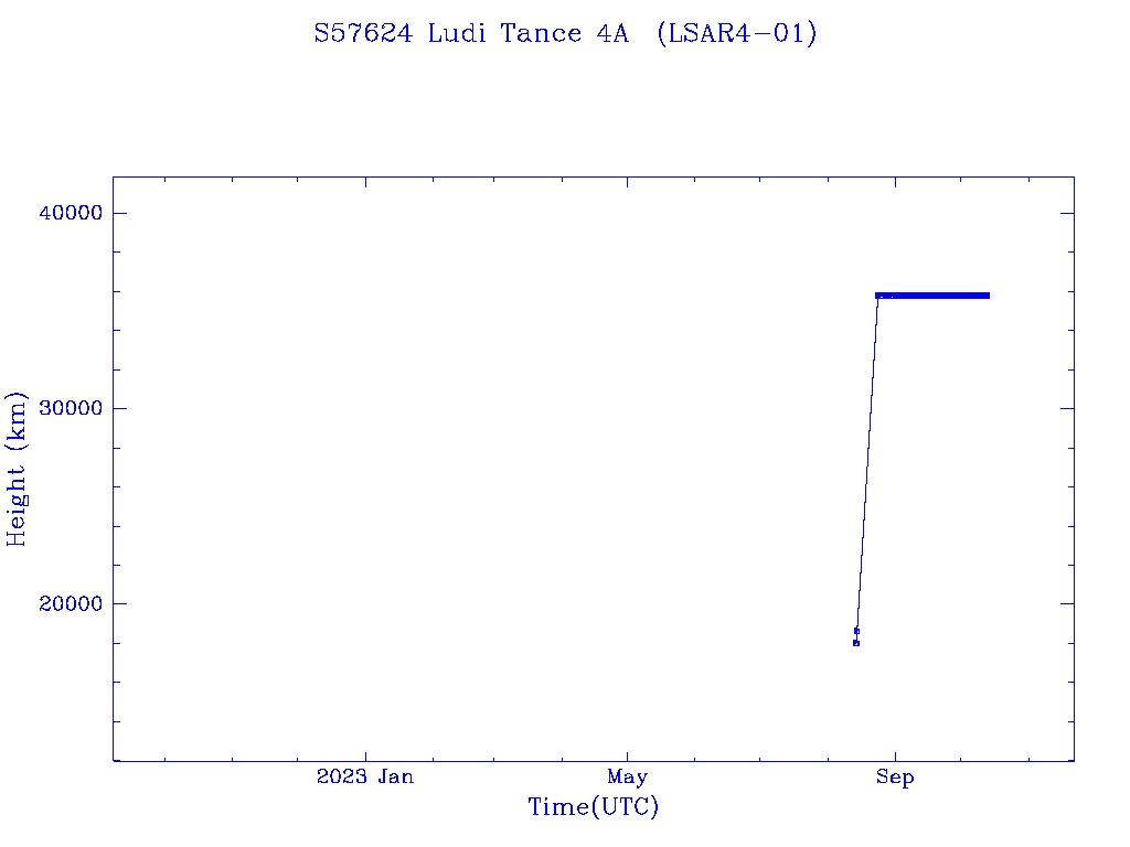 | 2023-120A | S57624 | Ludi Tance 4A | LSAR4-01 | LT4A GEOSAR | 2023 Aug 12 | 35777 x 35797 x 16.04 |  |  |