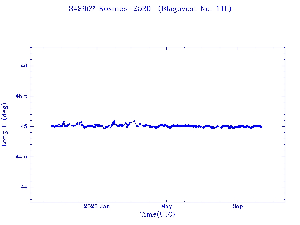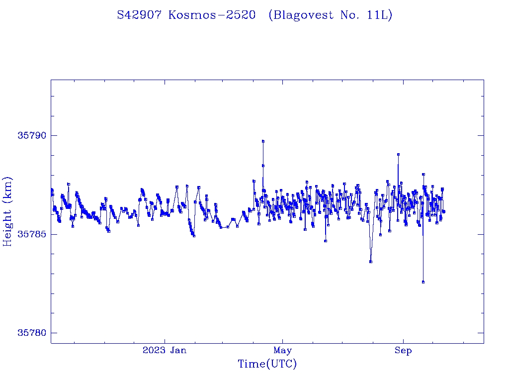 | 2017-046A | S42907 | Kosmos-2520 | Blagovest No. 11L | Military comms sat | 2017 Aug 16 | 35785 x 35786 x 0.03 |  |  |
