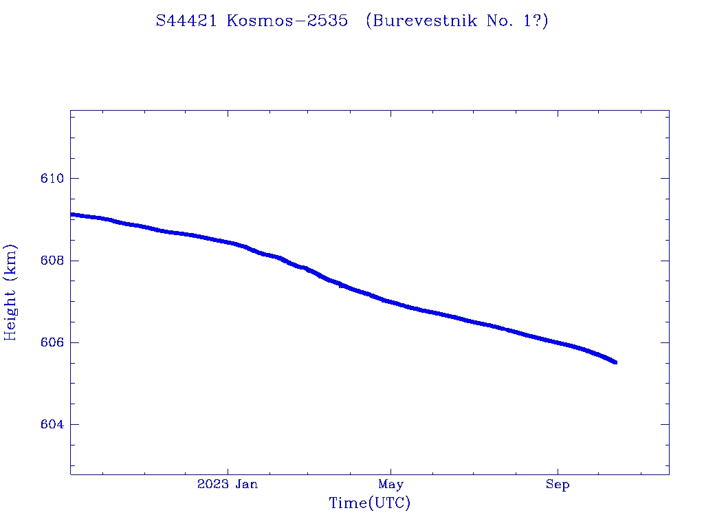 | 2019-039A | S44421 | Kosmos-2535 | Burevestnik No. 1? | Military experiment sat | 2019 Jul 10 | 599 x 611 x 97.71 |  |