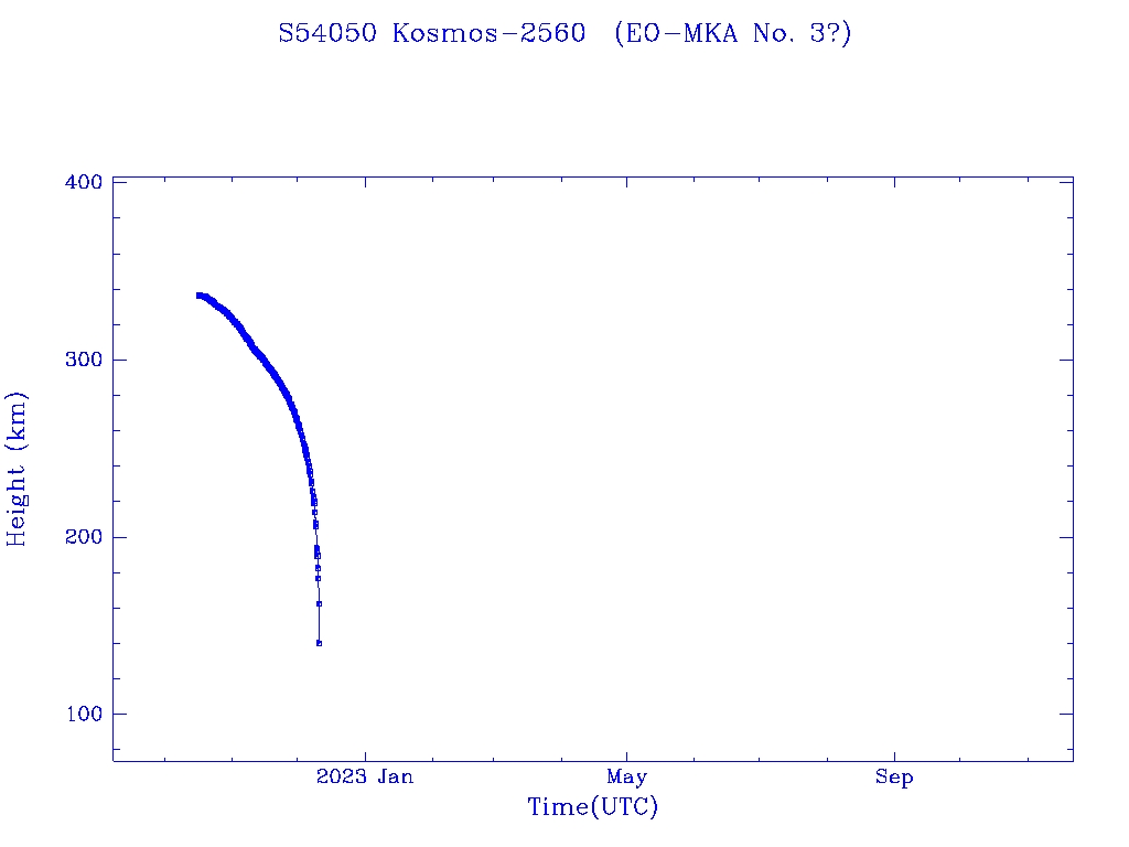 | 2022-135A | S54050 | Kosmos-2560 | EO-MKA No. 3? | Military imaging sat? | 2022 Oct 15 | 130 x 150 x 96.27 |  |