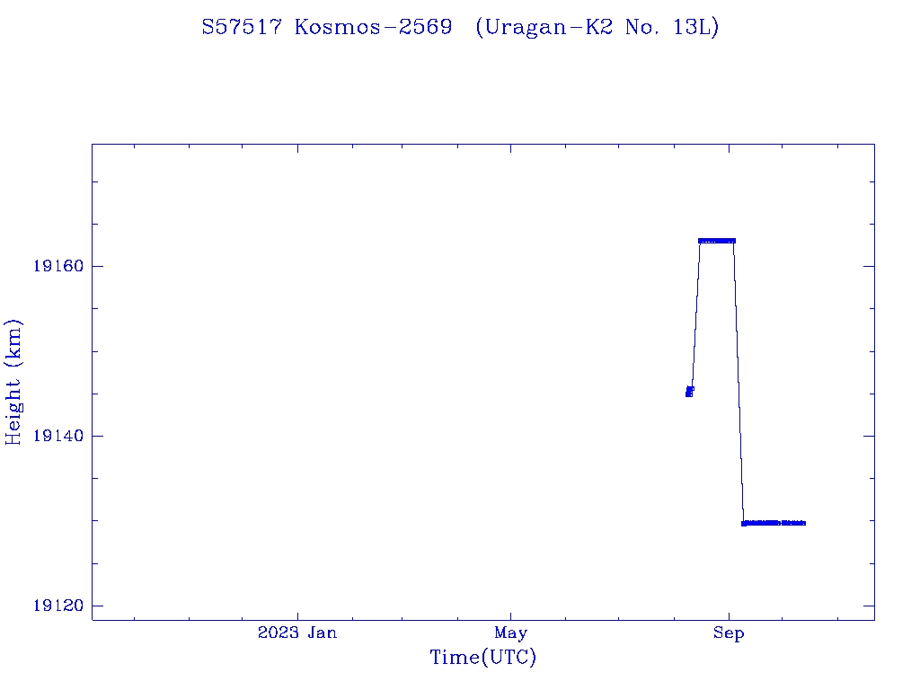 | 2023-114A | S57517 | Kosmos-2569 | Uragan-K2 No. 13L | GLONASS navigation sat | 2023 Aug 7 | 19107 x 19151 x 64.82 |  |