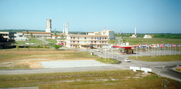 ELA2 area after gantry rollback. The Ariane 4 assembly building is on the left of the picture and V113 and its launch tower are on the right. The building in the center is Arianespace's offices.