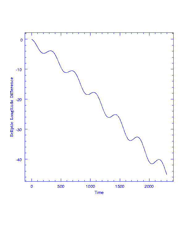 SIRTF trails Earth; longitude (deg) vs time (days). Every year it reaches its perihelion and speeds up a little, but on average it lags further and further behind. One degree of longitude is about 2.6 million km. The time axis runs from the year 2003 to 2009.