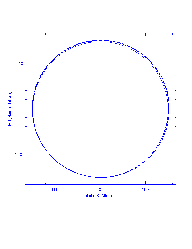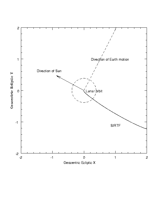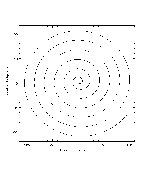 In an inertial frame centered on the Earth, in ecliptic coordinates, SIRTF makes a spiral outwards from the Earth. Units are millions of km.